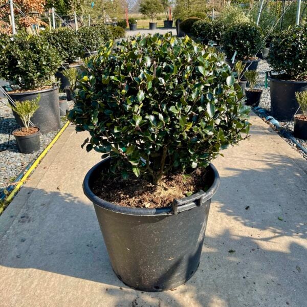 Less prickly than English Holly, slightly purplish stems, pink tinged flowers with a distinctively blue tinge to the leaves. This is a male plant without berries, so perfect for sleek and classic hedging, topiary & blobberies - being both reliable and hardy. Unclipped it could reach 10ft tall.