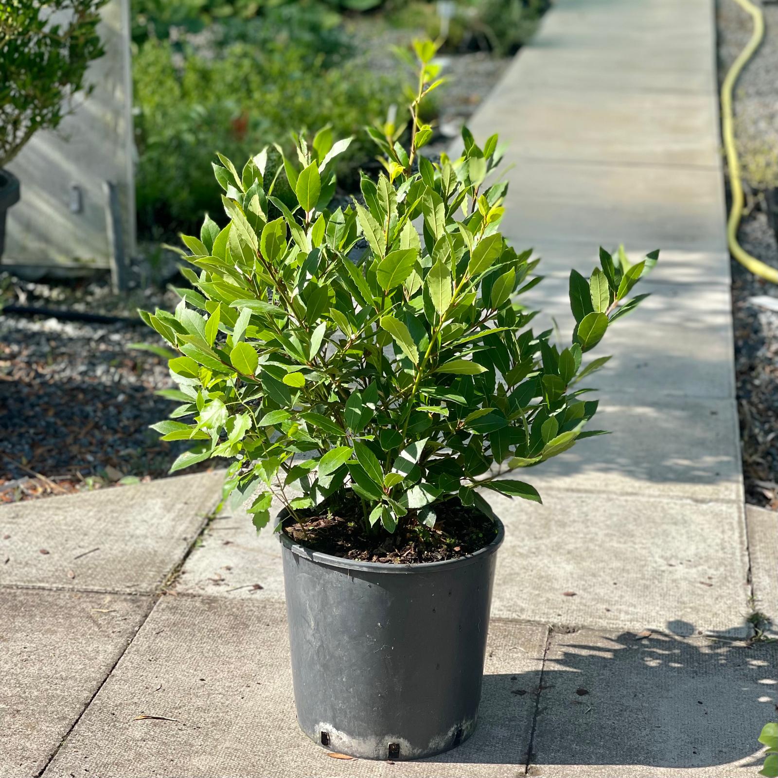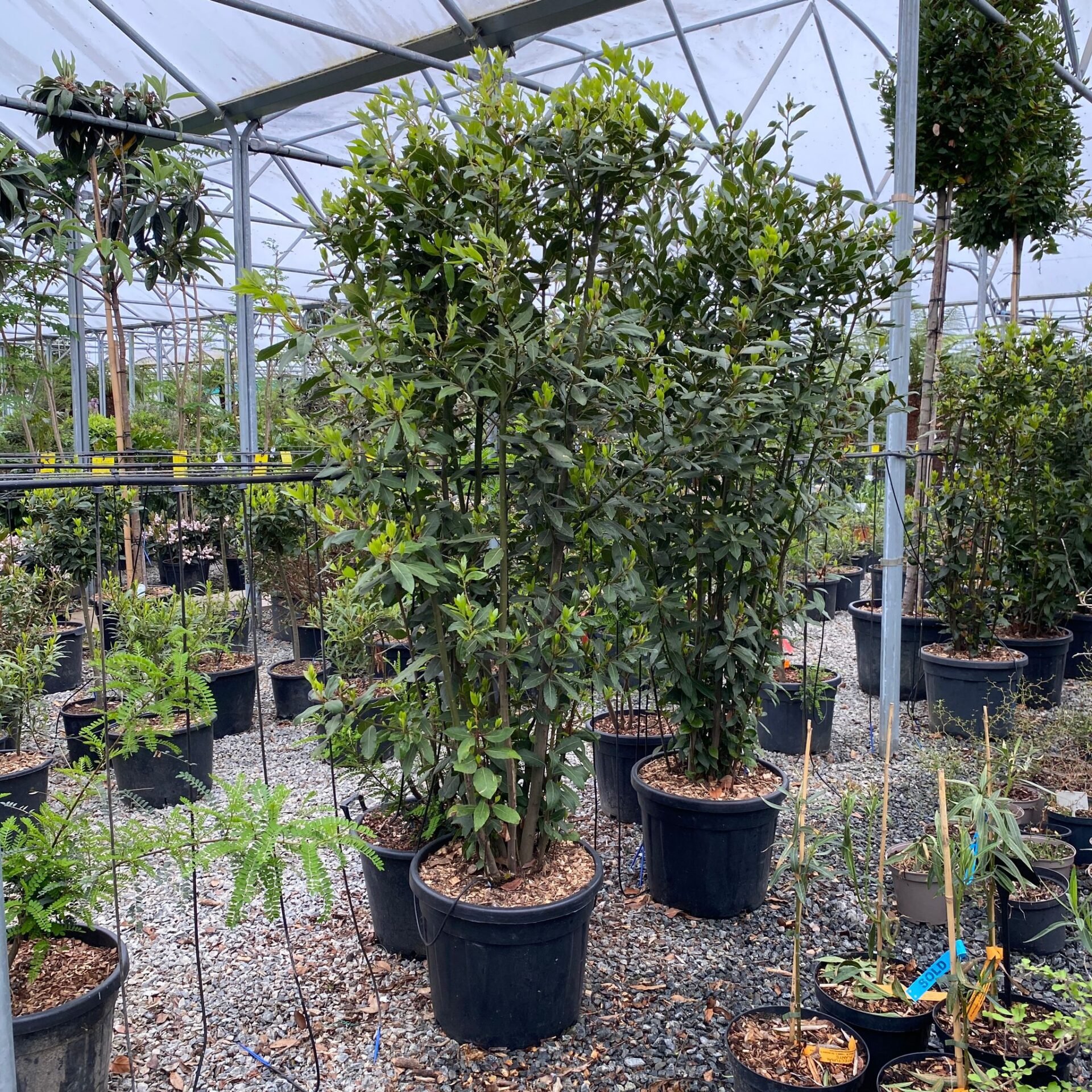 A tree of antiquity, of emperors and conquerors and victors crowned with laurel leaves, of pots framing doorways, of kitchen gardens and cooks. Beautiful, fragrant, familiar and beloved. Simple shaped bright green young leaves turning dark as they mature. Yellow spring flowers and black seedy berries. Can be left wild as a large shrub or clipped, pruned and shaped. Deeply dark green, medium-textured evergreen low-maintenance shrubs for making hedges. Really good hedges. If these came in a tin, that’s what the tin would say. They come in pots and they’ve been carefully trained and selected for the job in hand. That means they are ideal for creating pretty ‘instant’ hedges. Naturally quite slow-growing, these well-grown plants are just the ticket for making a really dense and chunky screen, barrier or hedge that looks mature in no time. Sturdy- trunked and thickly-clothed in lateral branches all the way up, these will weave and knit together and create a wall of rich dark green. Perfect for Mediterranean style gardens, naturally, Laurus nobilis is suited to all gardens really and in hedge-form make some of the best backdrops for contrasting shrubs and trees. Happy to be clipped and trimmed, they can be kept very tight and neat and are excellent for privacy. The foliage is aromatic and on hot days will fill your garden with their spicy, earthy scent. My Italian neighbour ‘prunes’ the bits she can reach from her window and then brings me a dish of pollo cacciatore swimming in a rich sauce infused with the trimmings. Laurus nobilis grown this way are highly recommended. As are Italian neighbours but we don’t sell those.