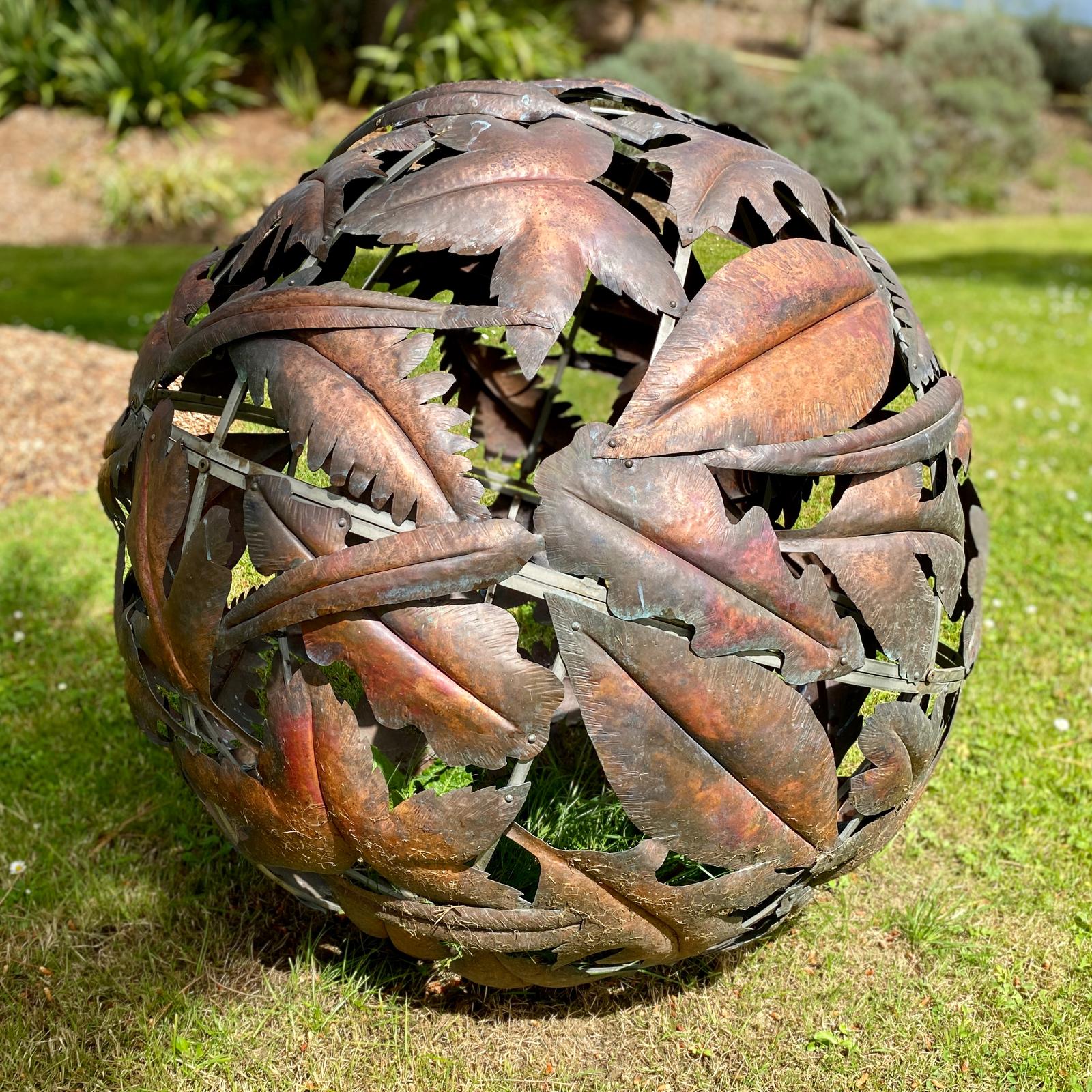 The leaf globe is created from the individually crafted copper leaves of British native trees. The globes are 1 metre diameter with a steel frame and suitable for exterior locations. They can be customised to suit individual situations such as being bolted down to a concrete surface or simply anchored into a lawn.