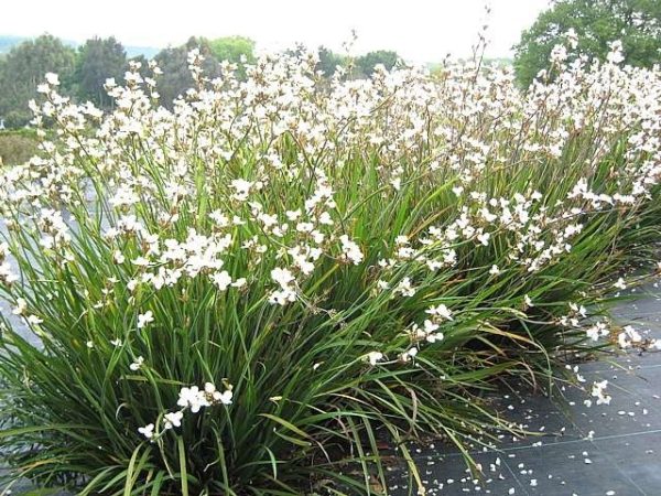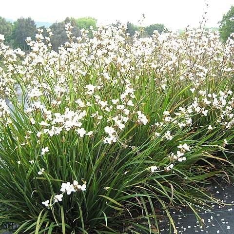Mini Phormiums with prodigious quantities of white flowers in late spring/early summer. Easy, reliable, well behaved and the flowers are long lasting. The plant's evergreen but as with most herbaceous stuff, it's worth cutting them to the ground (a single swipe with a good sharp pair of Okatune Shears) in early March so all the summer's growth is new, fresh and green rather than new fresh and green but full of all last year's dead stuff.