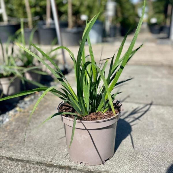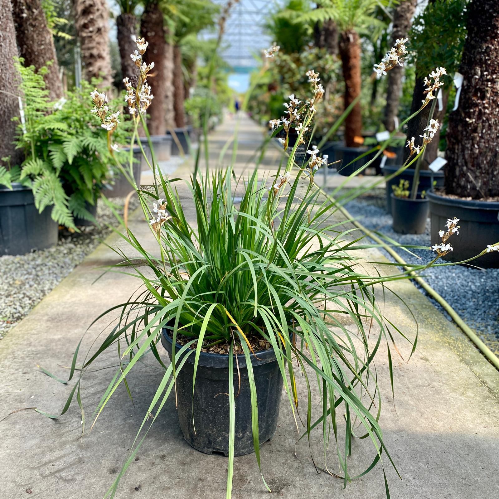 Like a little Phormium with white orchid-like flower spikes. Grows to about 3ft. Does well in a pot, flowers for weeks and weeks. Please contact us for other stock availability and sizes.