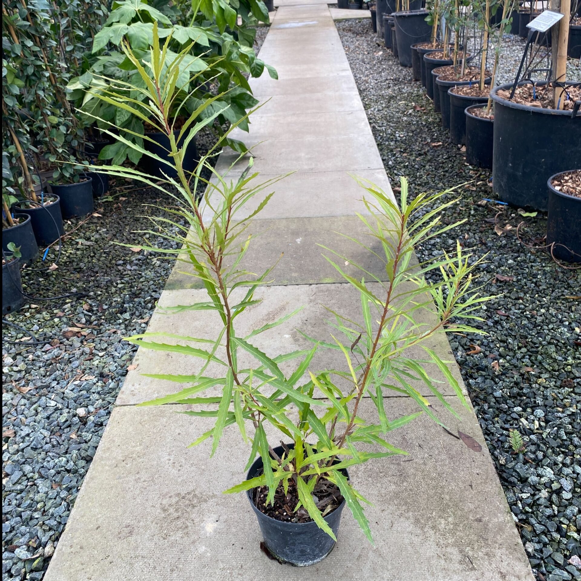 Ahardy evergreen with particularly fetching little leaves - long and thin and slightly serrated and in a particularly lovely shade of green. Left to its own devices however, it's a bit of a sprawling shrubby thing. We think we can improve on this arrangement and train them into little trees. They can reach 10ft after 10 years. They like a sunny spot on poor soil - see important notes below.