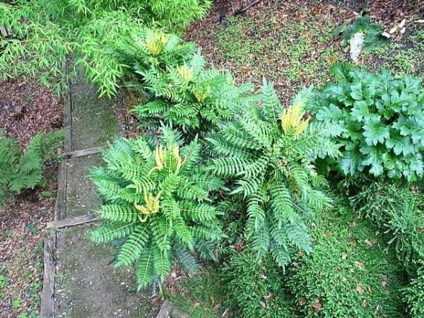 We've always felt this holds some well kept secrets but to unlock them needs the hand of a skilled secateurist with some advanced Creative Maintenance techniques up their sleeve. The rosettes of leaves have the same visual appeal - particularly when seen from above - as the much revered tree ferns (Dicksonia antarctica). The trouble is that (unlike tree ferns), Mahonias branch and produce so many of these rosettes that they all knock into each other spoiling each other's rosettes. The key is to have these rosettes at different heights. The solution is a combination of amputation (removing minor rosettes that imperil the integrity of major rosettes) and encouraging the branches to spread out with exactly the same purpose - to preserve the integrity of the major rosettes. This can be accomplished either by hemp string (pulling the branches away from each other) or (as we occasionally do on the nursery) using stout lengths of balsa wood with Vs cut in each end to push the branches apart. Bits of balsa wood stuck in your plants don't look great but branches 'set' surprisingly quickly and the string and the timber can be removed after a few months.