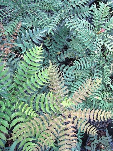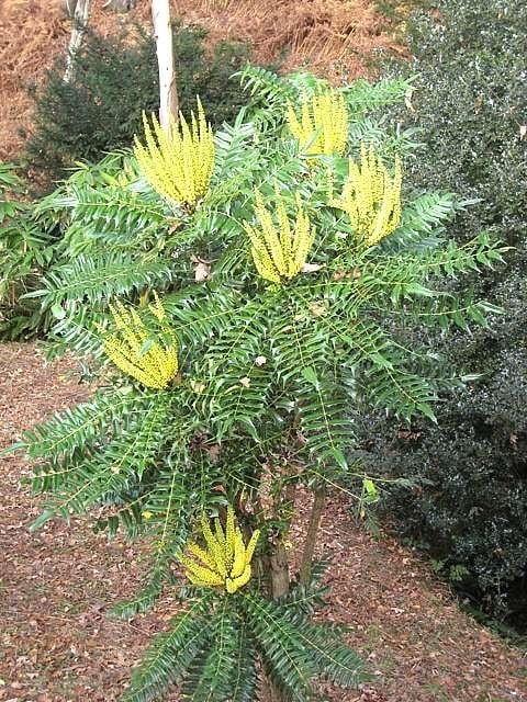 The most elegant and sculptural of all the many Mahonias. Beautiful symmetrical rosettes of leaves on a multi-stemmed scaffold. Can grow to 12ft or more. Sun or partial shade. Yellow flowers in the autumn. The new growth is many hued - mostly reddish.