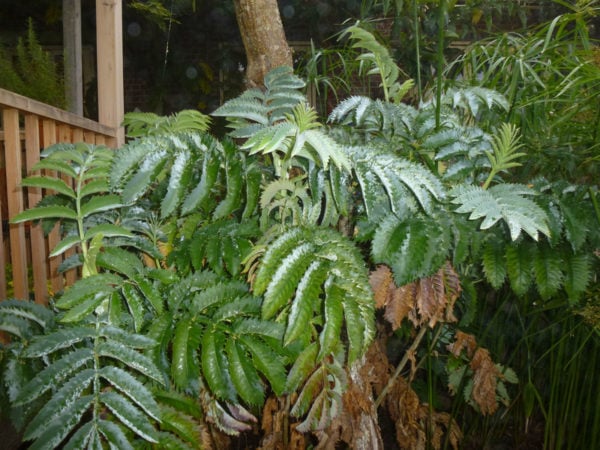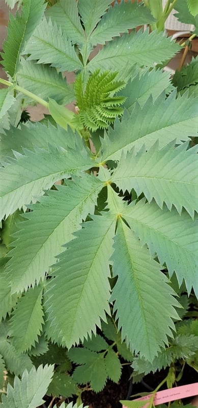 Great big bluey-grey saw edged evergreen leaves, dark red flower spikes and a strong aroma of peanut butter. It prefers plenty of light and reasonably well drained soil. In colder gardens, it'll get cut back by the frost but will re-grow in the spring. Always benefits from a bit of grooming from time to time - usually by just removing bent, brown and broken bits. In mild gardens where the frost doesn't control its size, it might get too big and leggy after a couple of years so never hesitate to cut back to near ground level in the spring for a better, more compact looking plant.