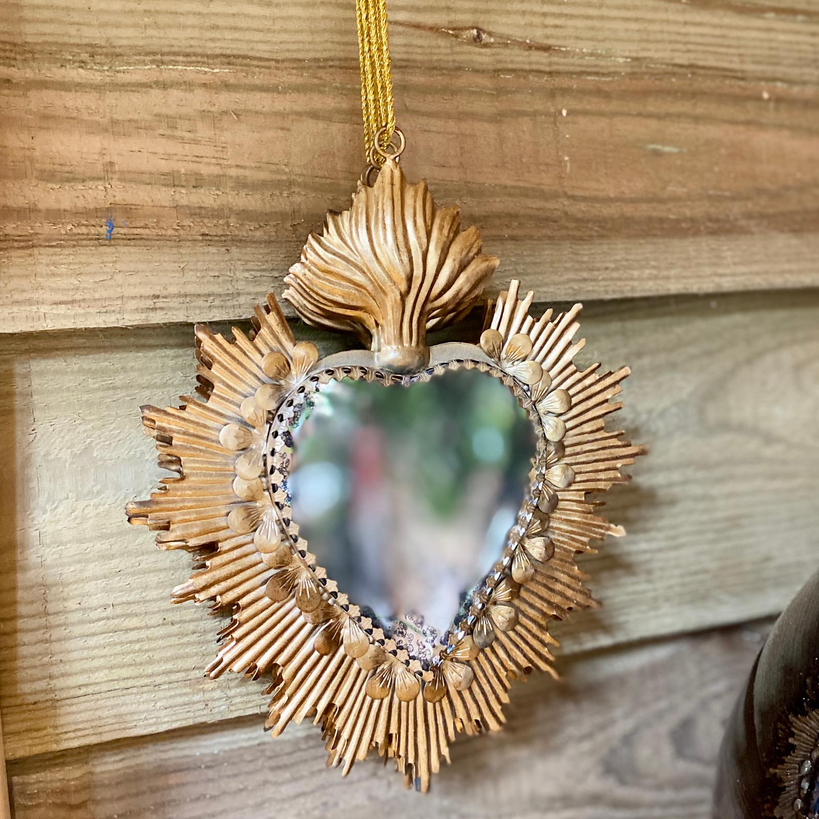Bring warmth, spirit, and artisanal charm to your space with this stunning Milagro Heart Hanging Ornament. This beautifully crafted heart features a radiant burst design surrounding a heart-shaped mirror, symbolising love, protection, and devotion.