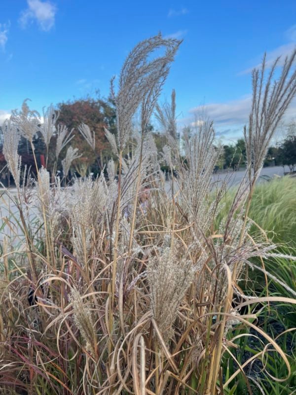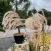As part of a designer’s palette, this one is essential for adding flurries of subtle movement and vertical drama. We use it in a variety of ways en-masse to create rolling expanses of soft architecture. It can also be planted as a feature and makes for an elegant stand-alone large specimen. Because of its height and spread, it’s a good choice for veiling parts of your garden rather than completely screening them or for defining areas of intrigue and focus. It’s particularly nice around a parterre or water feature where the swaying leaf blades will arch tremblingly to meet their reflection. Held clear above the plumes of swaying leaves, the abundant wisps of flowers last a long time, too. Emerging in August, rocketing skyward and producing a cloud-like corona of silver-white that hovers over the leaves, which in turn become coppery and mellow in autumn. A great combination as winter begins to creep into your garden, and other plants begin to fade.