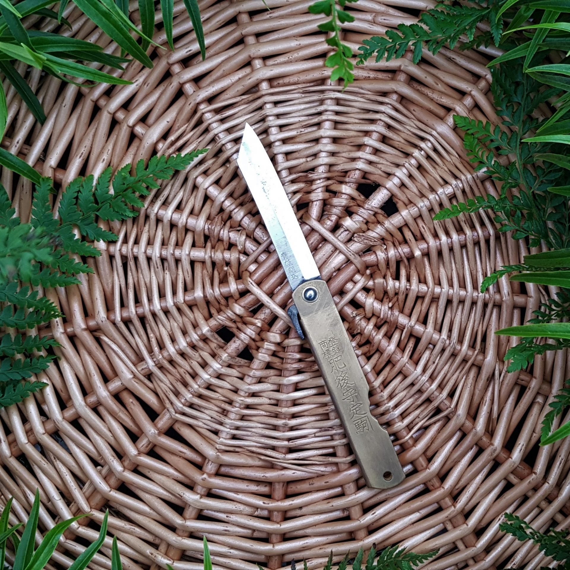 Traditional Japanese folding pocket knife from Kanekoma, brass handle, beautiful hand forged 3″ folded Hitachi aogami Blue Steel blade.