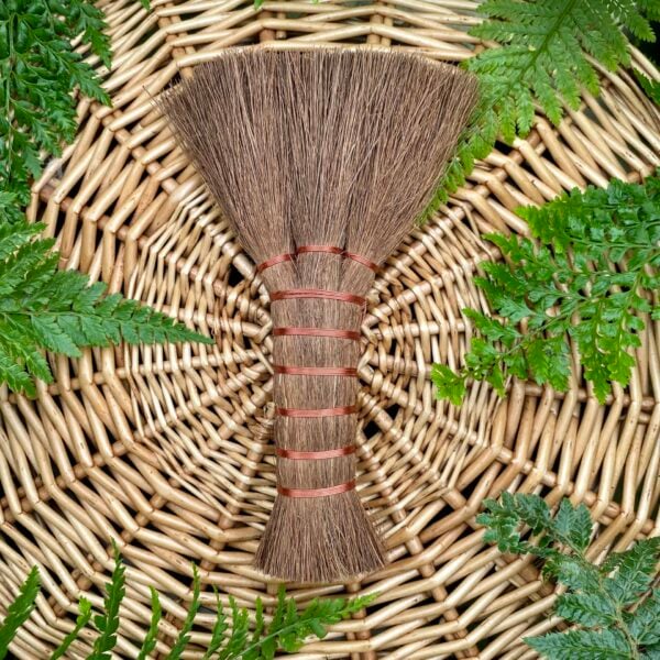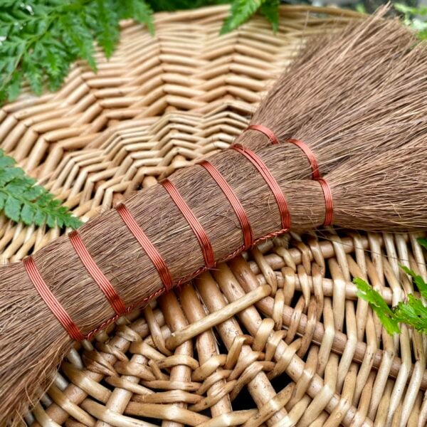 Small but classy Japanese hand broom for all your domestic chores! This little brush is made from the palm fibres of Trachycarpus fortunei, bound together with copper wire.