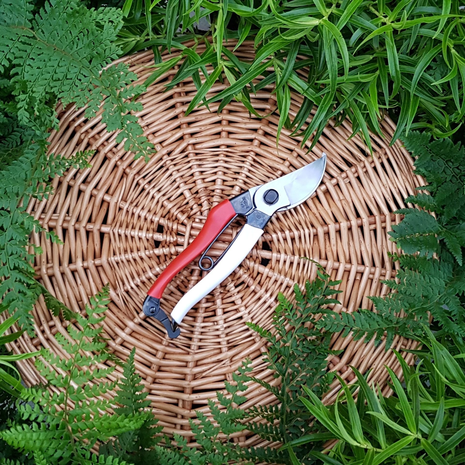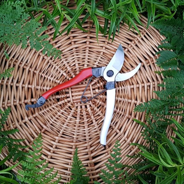 Okatsune secateurs are a popular for gardeners in Japan; they’re simple, sharp and strong. Unlike western brands, which rely on cushioning and gearing for a smooth feel, these have a more direct action, resulting in a very clean, efficient cut. The big chunky catch at the bottom has a crisp action that’s easy to use, even with cold wet hands or muddy gloves, and the spring is well secured and never accidentally pops out. Red and white handles? Red shows up in daylight, white at night, for all you nocturnal gardeners. Standard size fits most, while the small model is great for those with smaller hands or as a second pair and for flowers in the house etc. Large size have longer handles giving you more leverage.