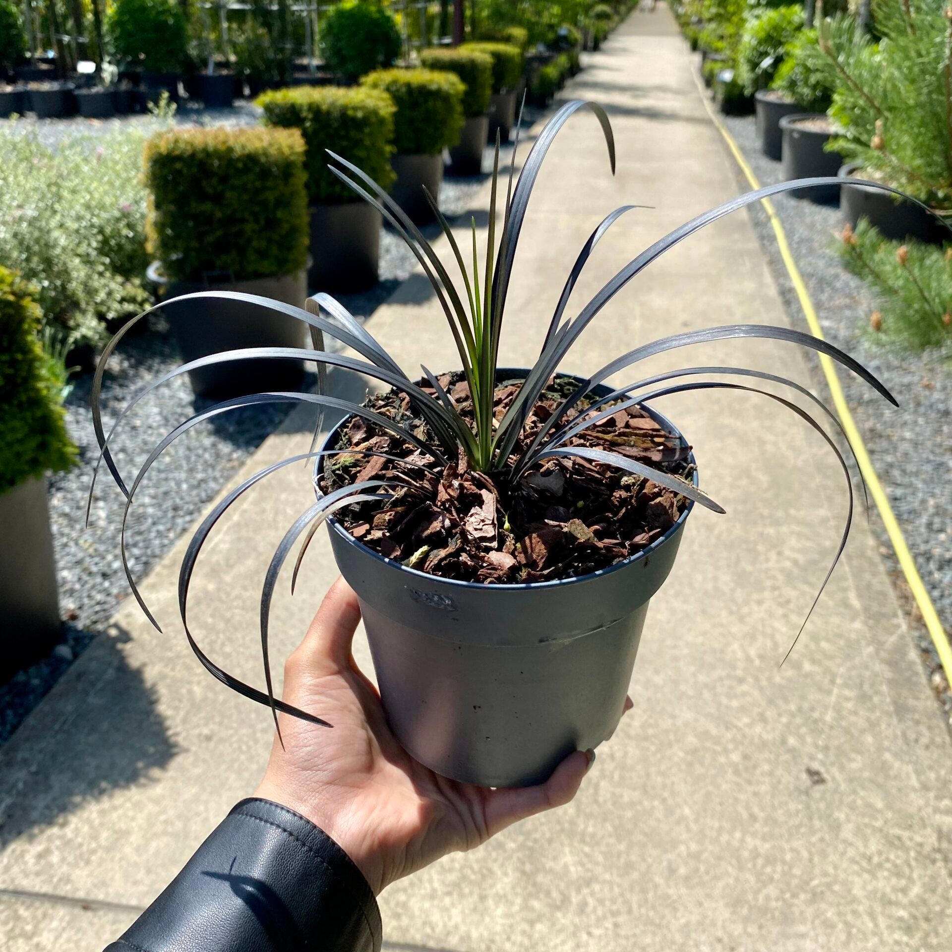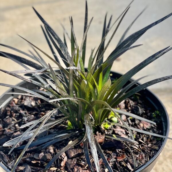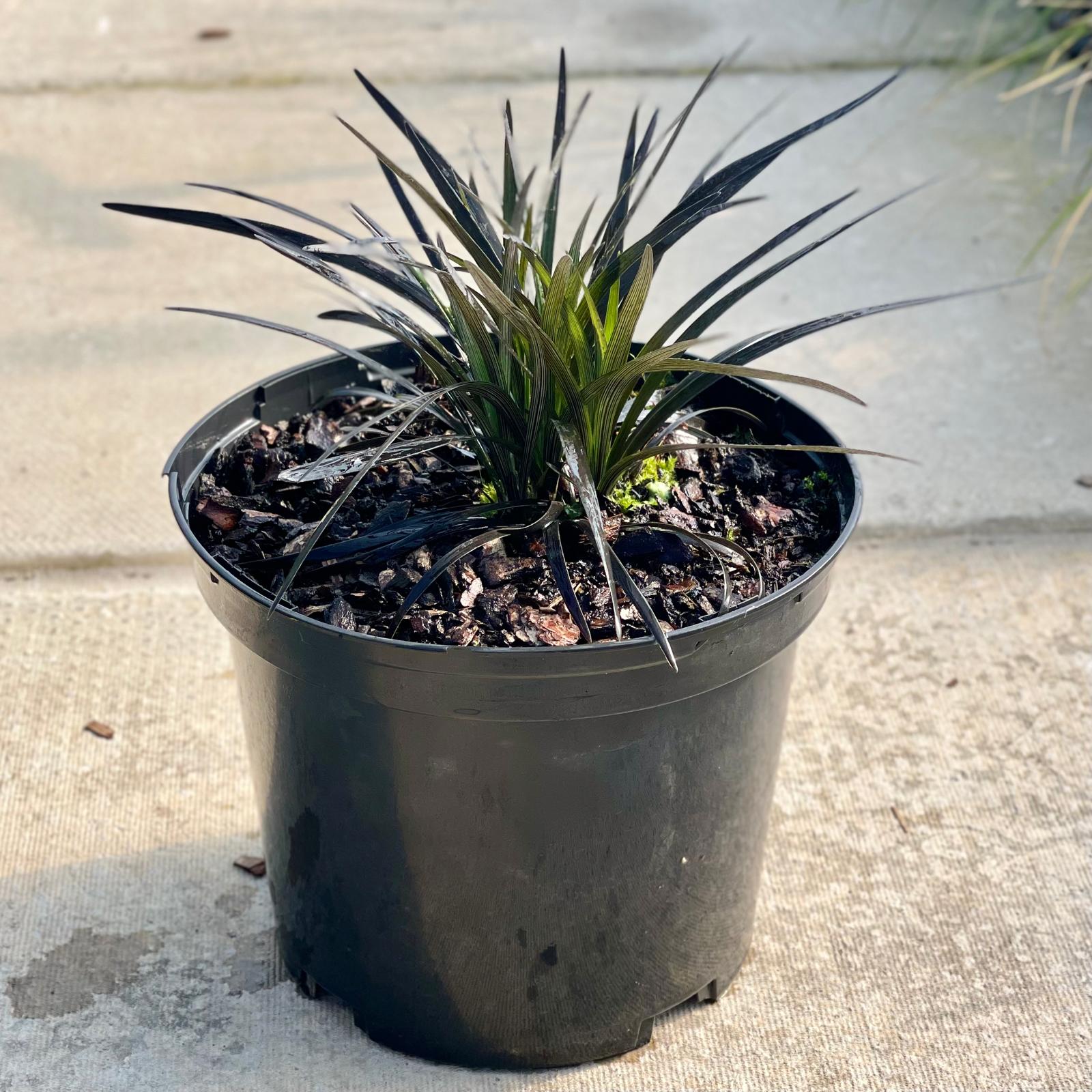 Clumps of evergreen jet-black grassy stuff 1ft x 1ft. Lilac flowers in summer, black berries in autumn. Slow growing and remarkably black.