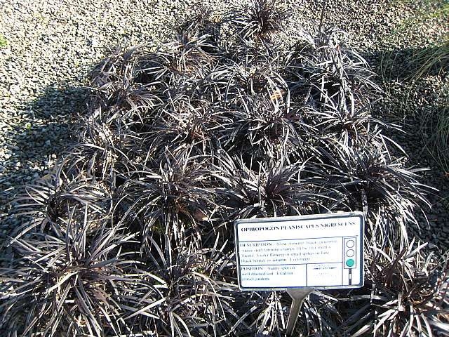 Clumps of evergreen jet-black grassy stuff 1ft x 1ft. Lilac flowers in summer, black berries in autumn. Slow growing and remarkably black.