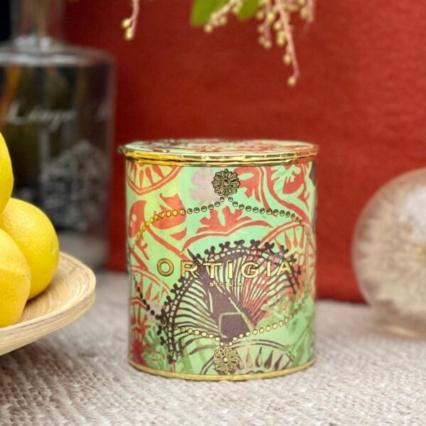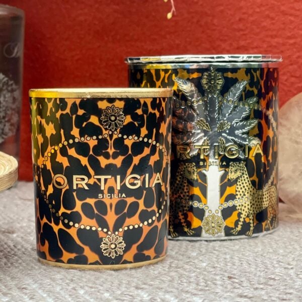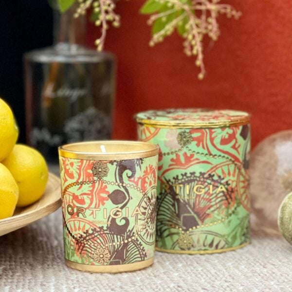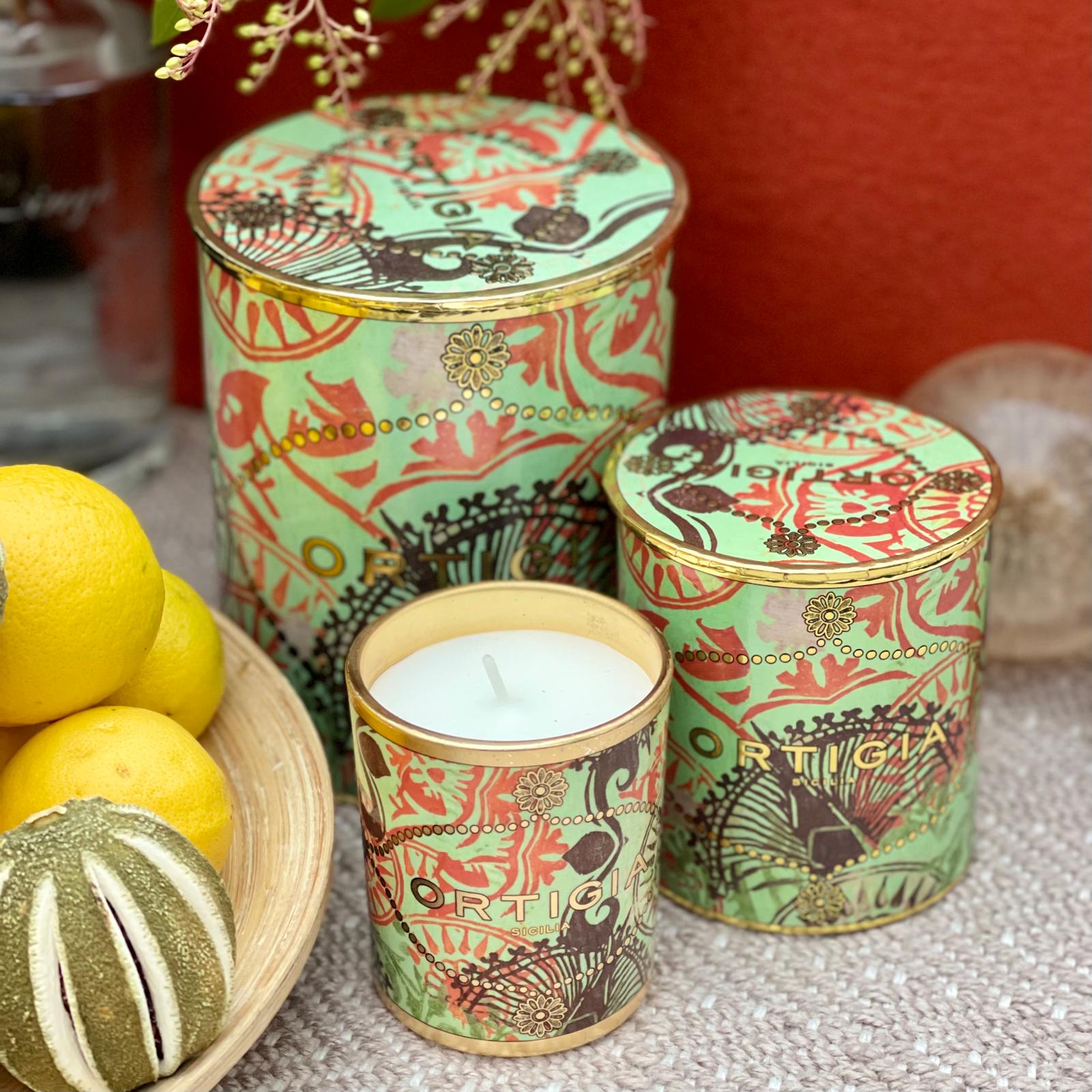 Ortigia’s Sicilia Decorated Candles. Available in 3 different waxes: Amber, Green or Gold. Each choice of candle has a unique exotic scent. Every glass jar is handmade with gold foil details. All create a stunning effect as they burn. Various sizes available.