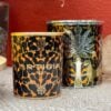 Each choice of candle has a unique exotic scent. Every impeccably decorated glass jar is handmade with gold foil details, the print creating a stunning effect as it burns.