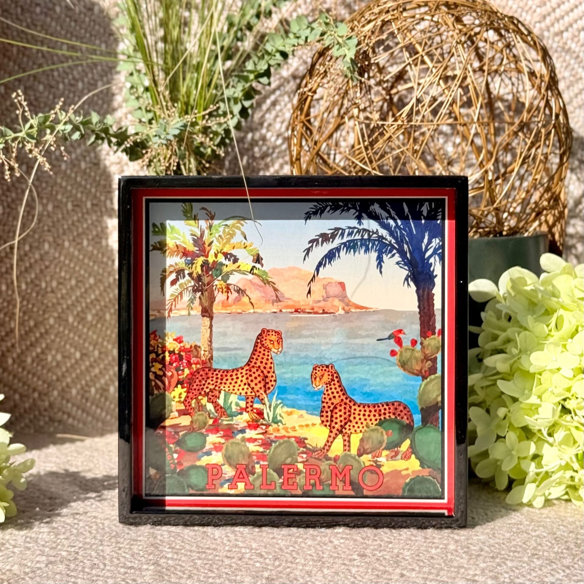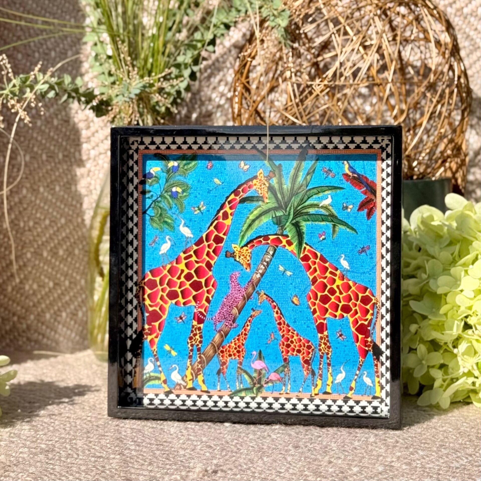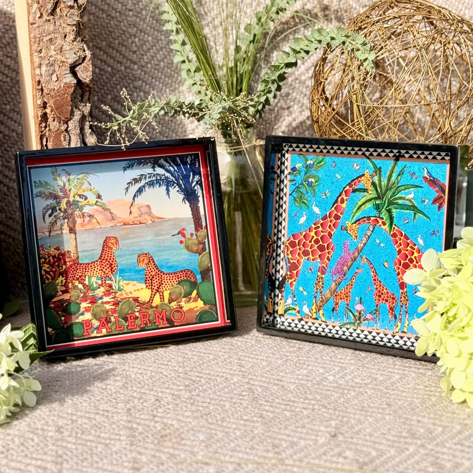 Introducing a splash of playful elegance to your home with this these exquisite 16 × 16 cm lacquer trays, adorned with artful giraffe motifs and leopard landscapes.
