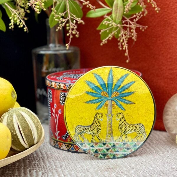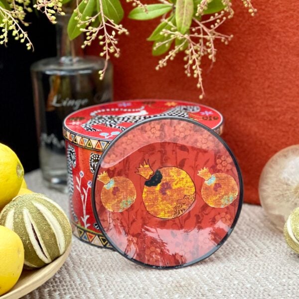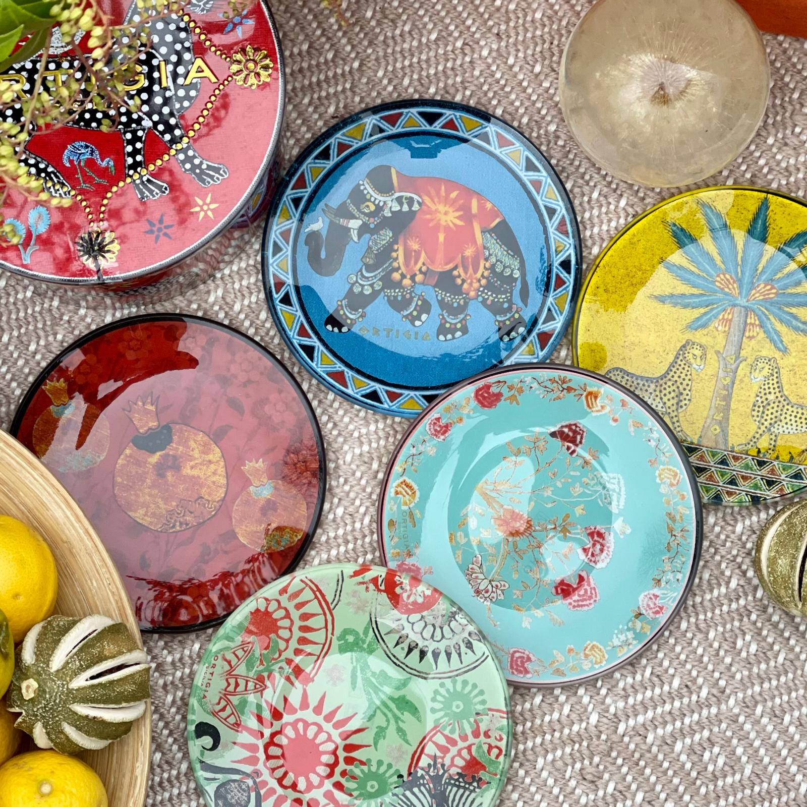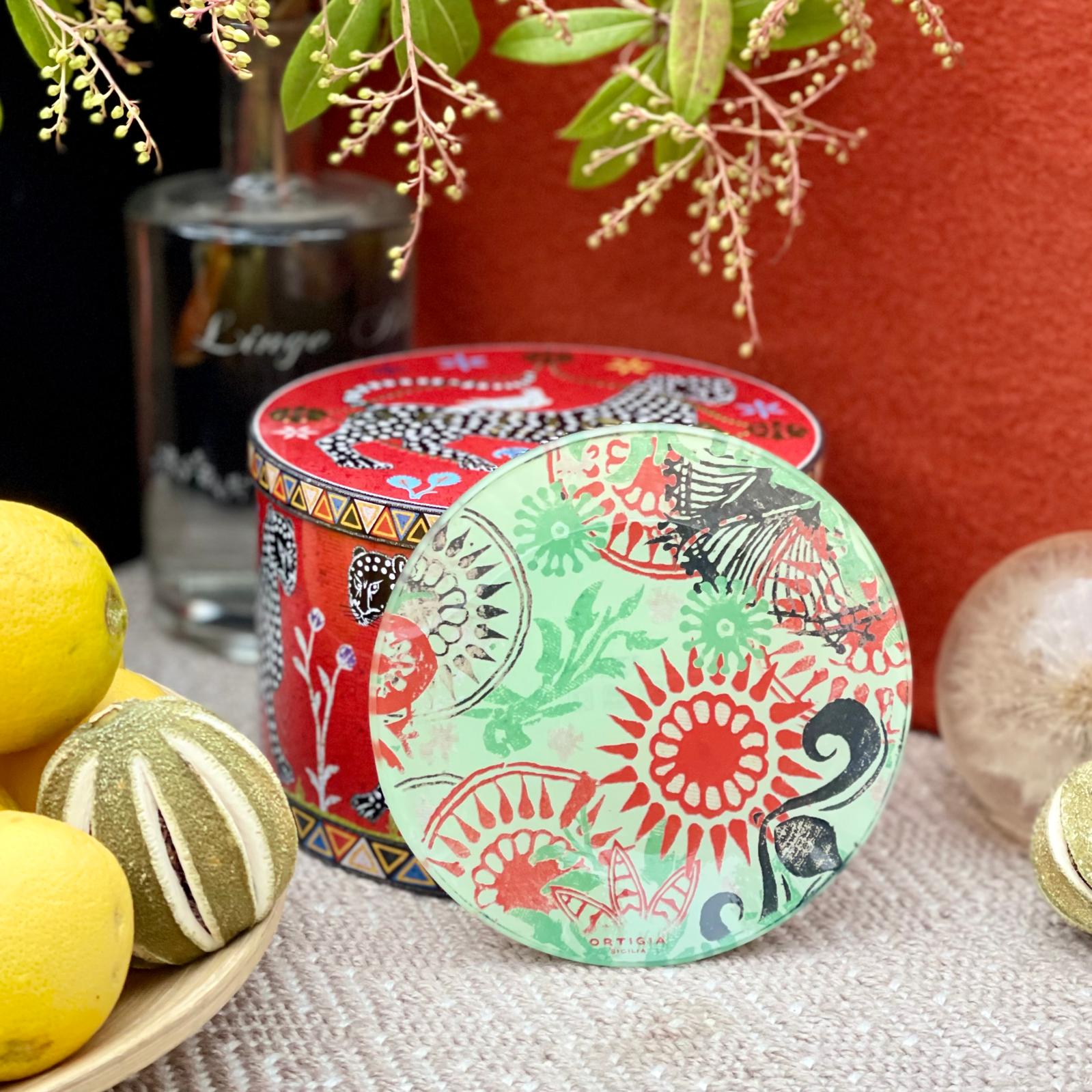 5 alluring and bold glass plates contained within an impeccably designed tin. Handmade with unique illustrations: Fico, Florio, Melograno, Sandalo & Zagara