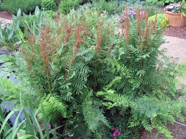 Royal Fern. Big (4ft x 4 ft), splendid and has the useful knack of growing in quite boggy places. One could say it's less fussy than most ferns. It has a huge geographical distribution throughout Europe, Asia and Africa which often gives a clue to a plant's fussiness; the smaller then distribution, the fussier, the larger the distribution, the easier. Not hard to work out why. When the fronds bear spores, they become brown and erect - a very noticeable part of being a Royal Fern. Deciduous - they die down in the winter like most ferns in temperate parts of the world. Not sure 'deciduous' is technically the right term.