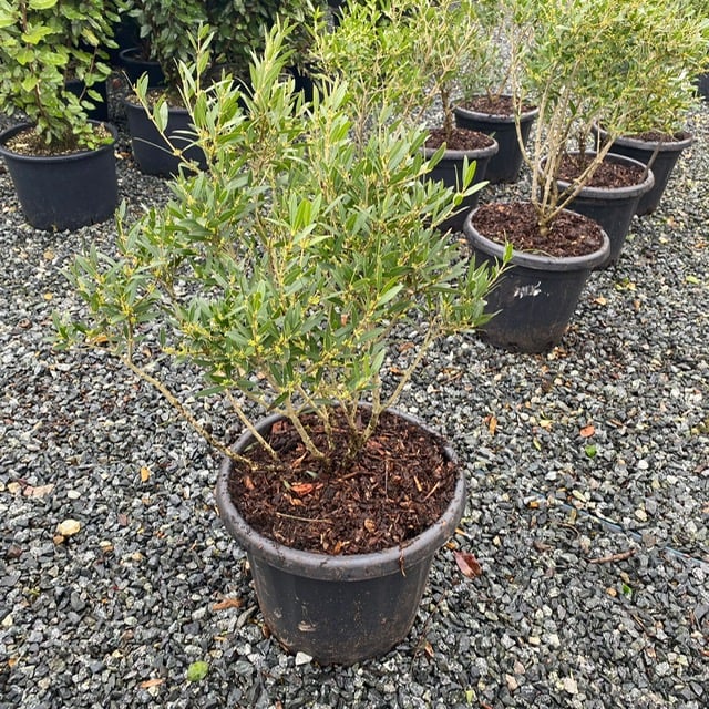 Evergreen shrub growing to around 10ft tall. Narrow, dark green leaves to 6cm long, and small clusters of fragrant flowers in late spring and early summer. Looks good clipped into blobs. Please contact us for stock availability and sizes.