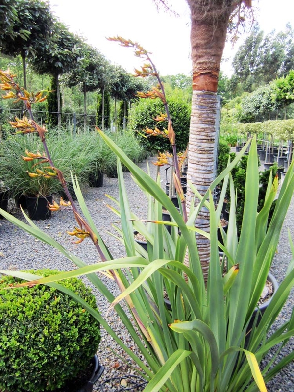 Greener, laxer and more luxuriant looking than the better known Phormium tenax. Lush and jungly. Yellow flowers on 5 ft spikes. to 5ft tall x 5ft wide.