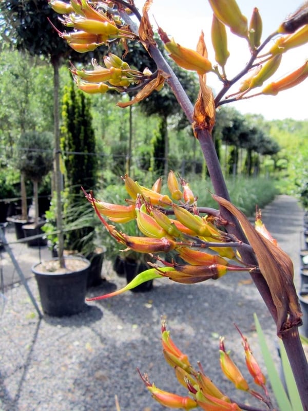 All Phormiums (whether P. tenax or P. cookianum) are described by proper botanists as having a 'broad genetic base'. This means highly variable and incredibly unpredictable. Sow 1000 seeds and hardly any will be the same; they will vary in the way they look and their frost hardiness. However, this particular plant seems to be the exception that proves the rule; they're all grown from seed from plants that have been growing in Cambridge Botanic Garden for many years and they're extraordinarily uniform and perfectly hardy. All other Phormiums we grow are clones. These are not. You'll sometimes hear the expression 'comes true from seed'. This is a good example - sow a bunch of seeds and the seedlings are uniform. In the case of Phormiums - incredibly unusual.