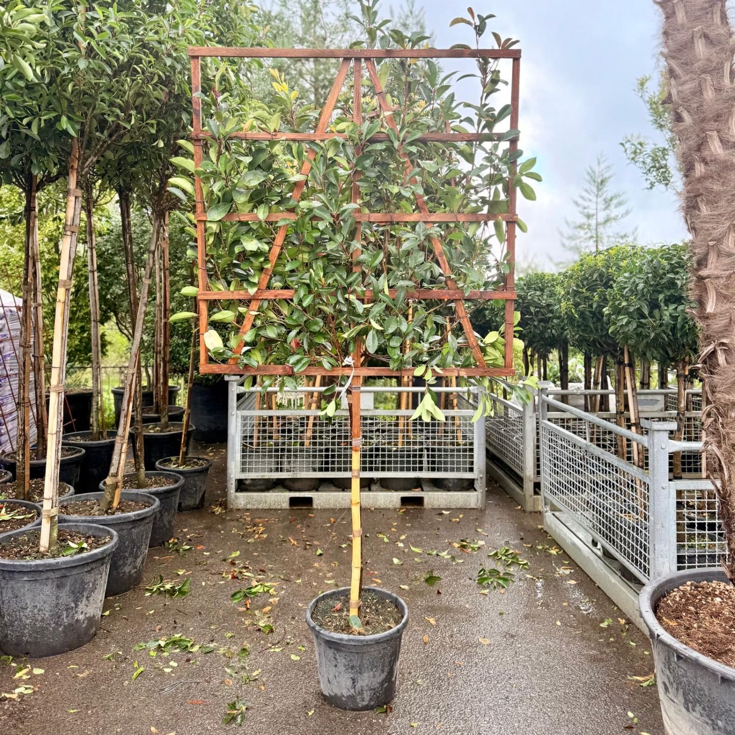 Pleached Photinia glabra. When architecture is thrust upon them in this way they are a highly attractive screening option or an instant two-dimensional hedge-on-legs. A bamboo or metal frame is attached to the top of the trunk within which the stems are grown and trained. Brilliant where space is limited. They provide both vibrant leaf colour and a flourish of exuberant flowers from March to late April / May. Pleached photinia glabra will need clipping regularly, which not only encourages dense growth but also means that there is lots of new, beautifully red foliage.