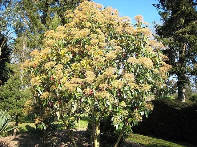 Round headed, big evergreen leaf, apricot coloured shuttlecocks of new leaves very early in the spring followed by copious quantities of frothy white flowers. The common name is Chinese Hawthorn as it's related and the flowers look and smell quite Hawthorn like. It's also very closely related and similar in many ways to Eriobotrya japonica (Loquat or Nespilo). It has the seductive and unusual habit of growing quite fast to about 15 ft and then slows down. A 20 ft tree is quite unusual but then this tree is rare in cultivation so what do we know? I only know of one in Ventnor Botanic Garden and one in Ryde High St (both in the Isle of Wight) and one near the old Spitfire factory in Kingston, Surrey.