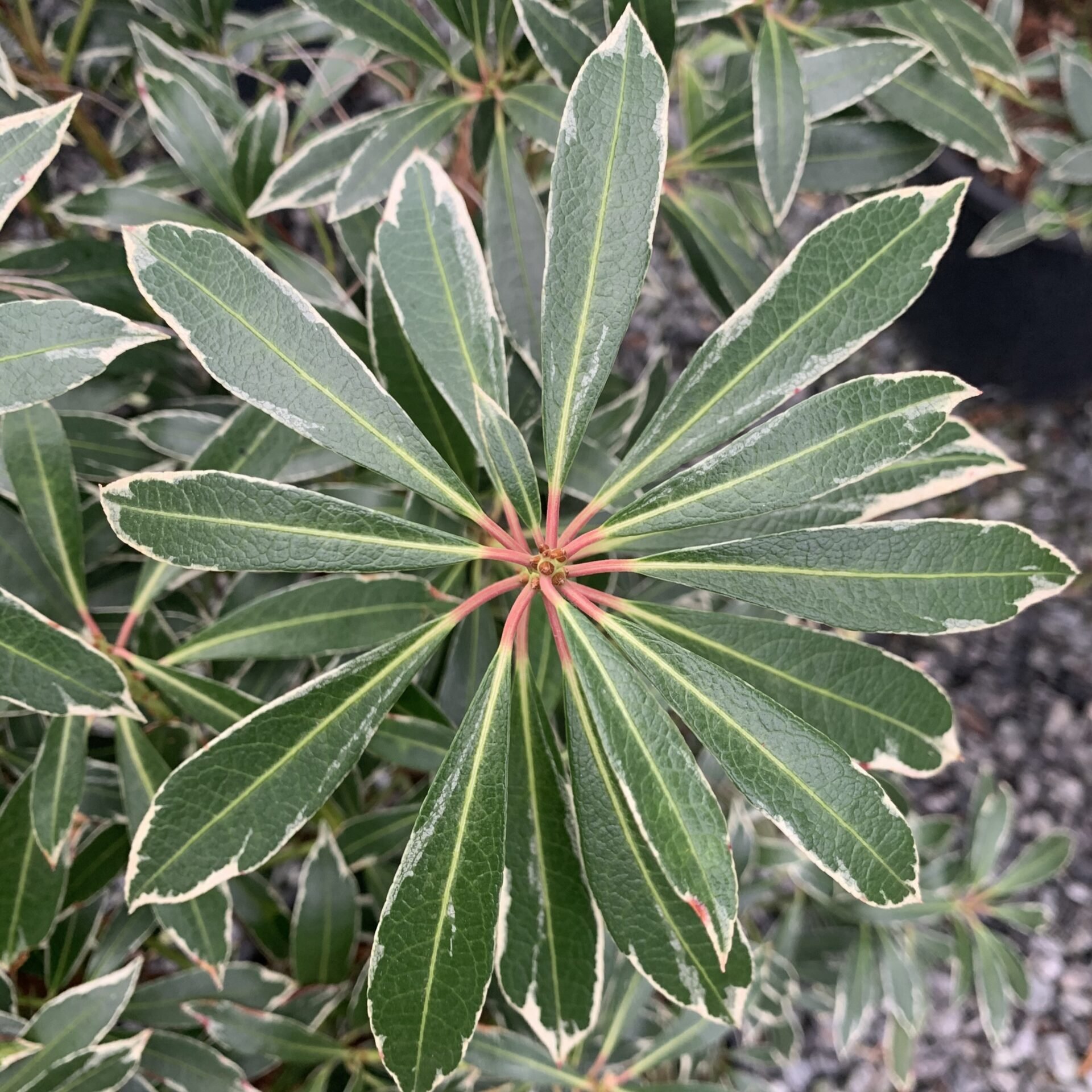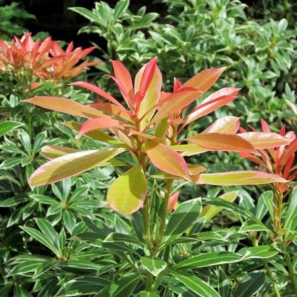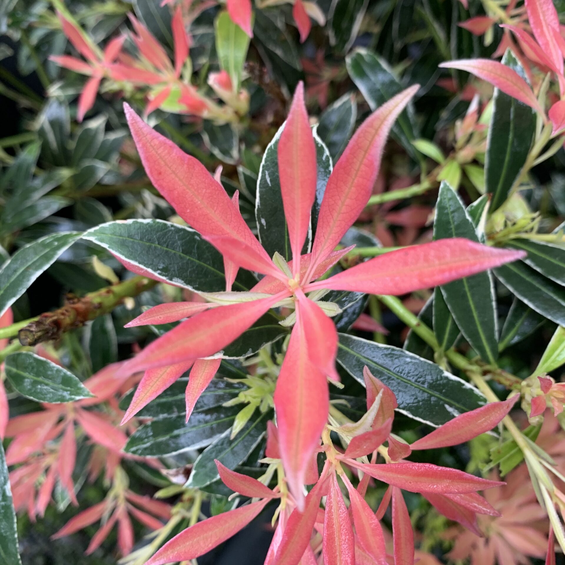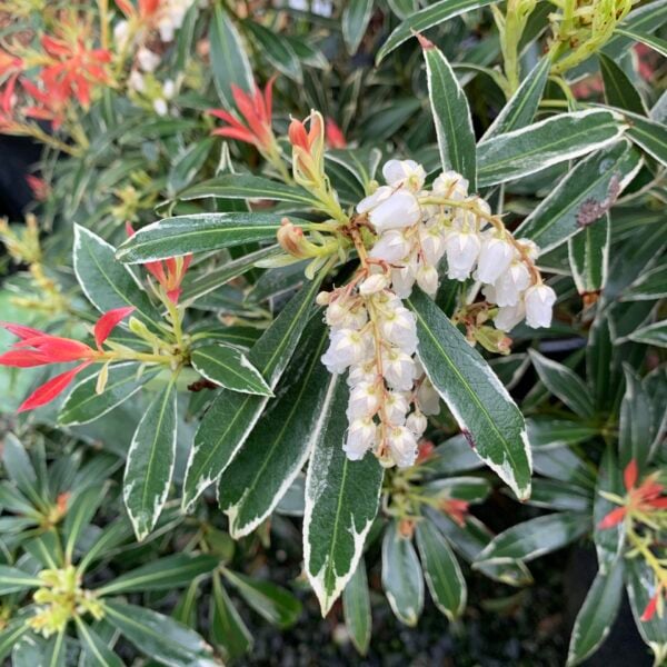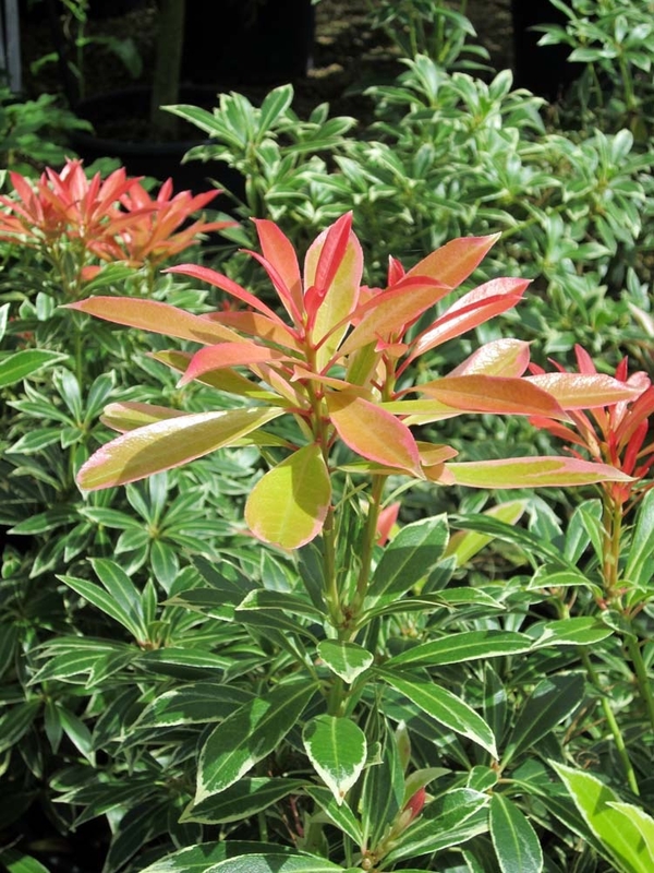 This is a variegated form of the Japanese Pieris and therefore is slower growing (variegation on the leaves = less chlorophyll = less photosynthesis = less growth) than all the other Pieris we sell. The young growth is red. 3 ft in 10 years.