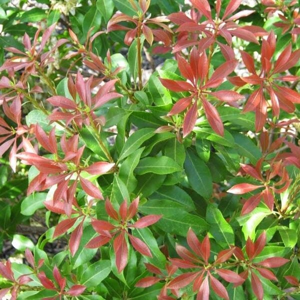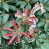 Nice mound of evergreen foliage with dark red new leaves in spring followed by white bell like flowers. 6ft in 10 years. Please contact us for stock availability and sizes.