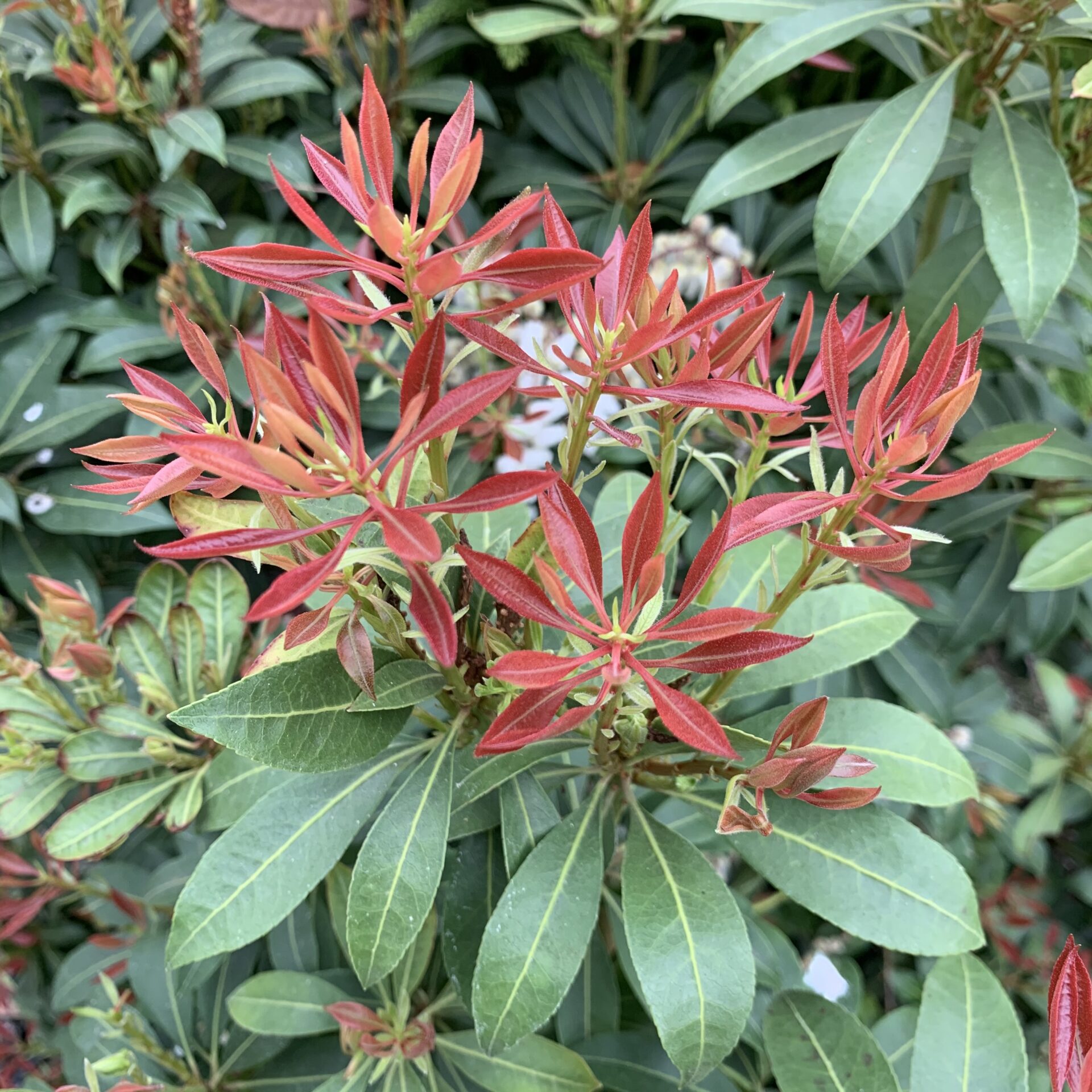All the Pierises create a shapely, layered, lumpy-bumpy profile in time. It might take 15 years in some cases but it's definitely worth the wait. Apart from this wonderful shape, you have prolific quantities of white hanging bell shaped flowers, gorgeous new red growth and beautiful stringy bark on older plants. Some of the shapely little Pieris trees found in National Trust gardens planted by Victorians, are worth the entrance fee too.