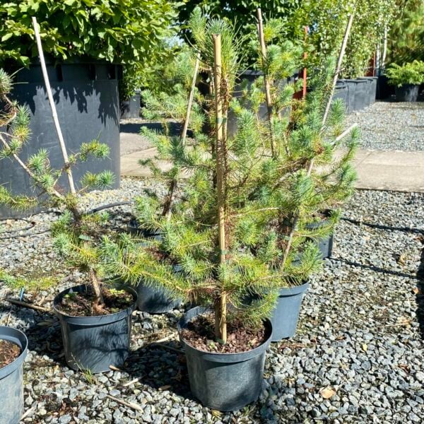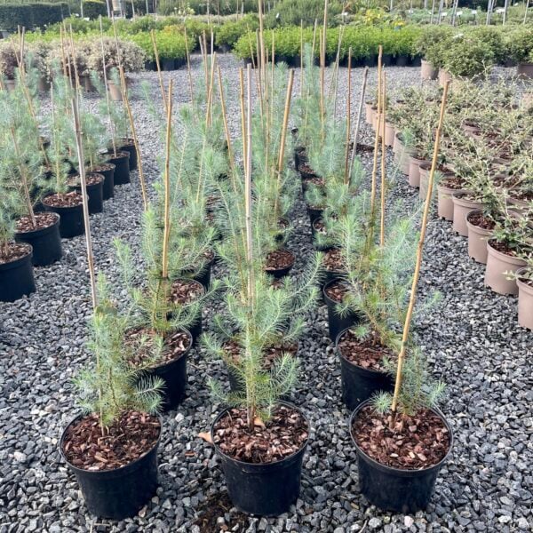 The large plants we sell are from seed from Italy and are famously top heavy so if planted in a very windy spot, may need guying, rather than just staking. If you visit the nursery, we have a grove in a very windy spot and they're all guyed. The smaller plants are grown by us from seed and will exhibit the characteristic juvenile foliage (short and grey) which makes the identification of seedlings of this plant so easy.