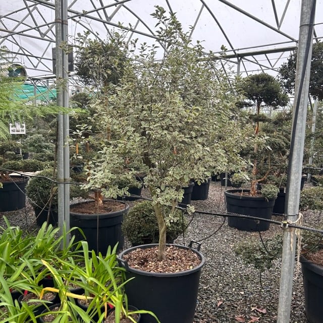 A pretty, properly bushy bush. An upright, rounded and evergreen shrub with the most delicate little leaves, pale green and frosted in cream with a tiny speckle of pink at the edges. Masses of them in huge abundance on the slenderest of wiry stems give these shrubs a ‘fluffy’ appeal. Extremely pretty and a must-have for virtually any garden, it does like to be protected from strong cold winds. A sunny and sheltered spot would suit a solo specimen, they look especially effective planted among, or in front of, solid-green evergreens where their variegation really pops and adds contrast. Happy potted, if you’ve a courtyard to fill, although they also make marvelous low hedges and attractively dense living screens.