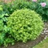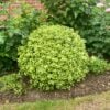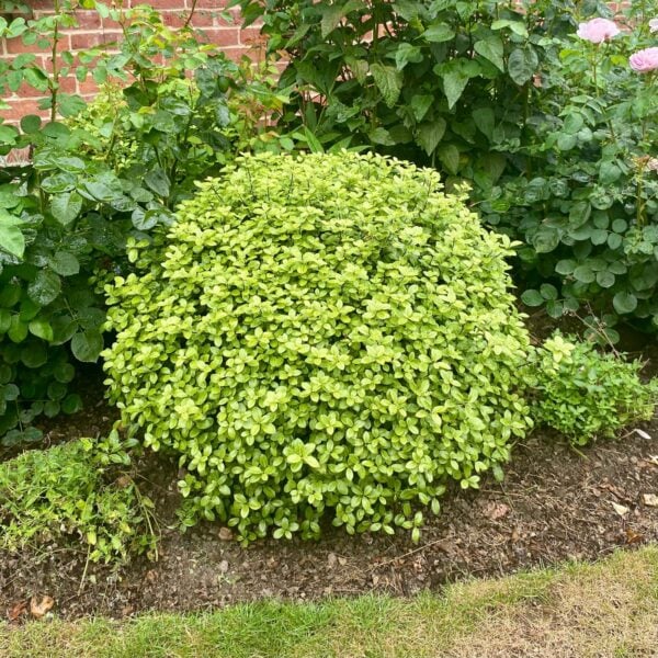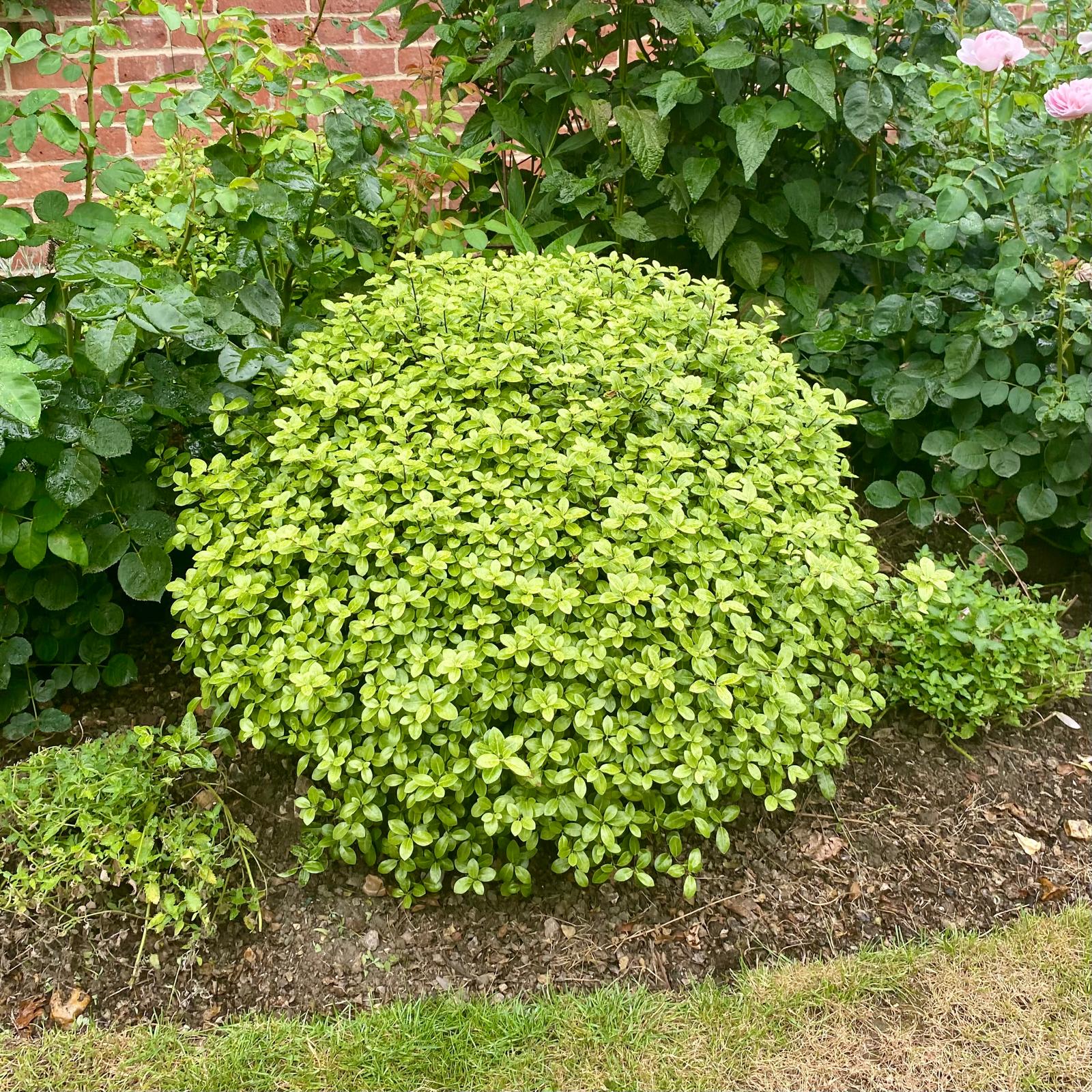 Naturally forms a dense mound of small sea green leaves. Has small dark purple sweetly fragranced flowers in late spring to early summer. Forms a 4ft blob in 5 years. Trim after flowering to maintain shape and density. It's immensely variable and there are many different varieties (we do several) and this relatively new form was discovered by a grower in West Sussex who happens to be a keen golfer. Does it look like a golf ball? Slightly.