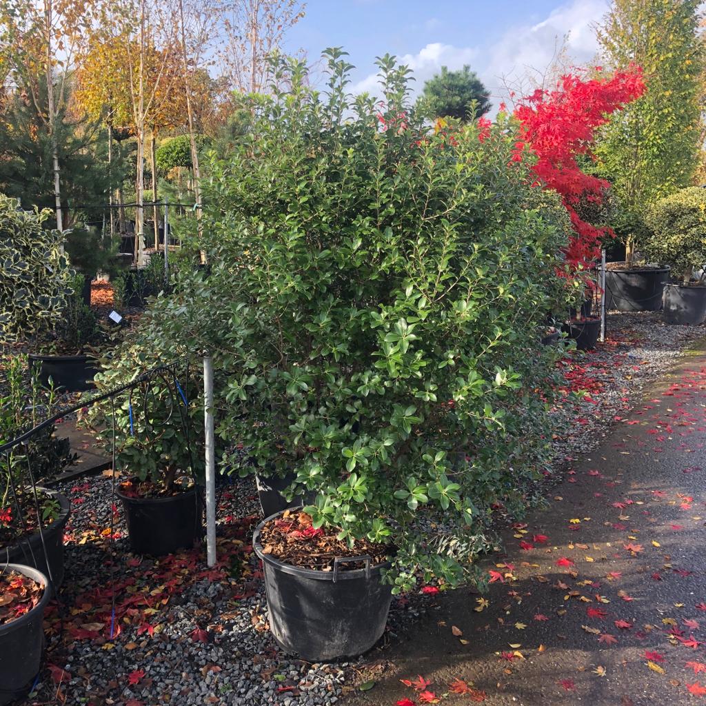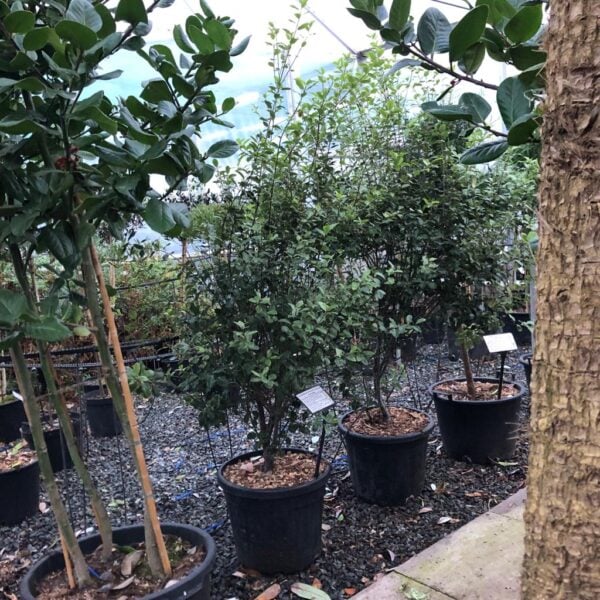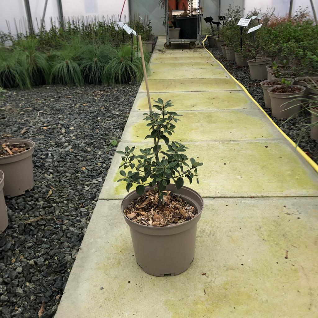 Small upright shrub, glossy leaves edged with fine silver hairs on the leaf margins. The inconspicuous, burgundy coloured flowers are lightly scented. Height 3m and spread 2m over 10 years.