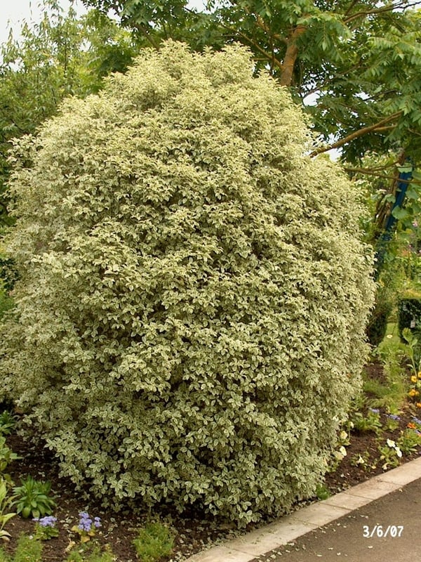 This well known little variegated evergreen tree from New Zealand comes in many different forms. Left to its own devices it's a multistemmed little round headed tree growing sometimes to 15ft or more. Just as often, it's used for topiary as it clips well into lumps, bumps and mounds.
