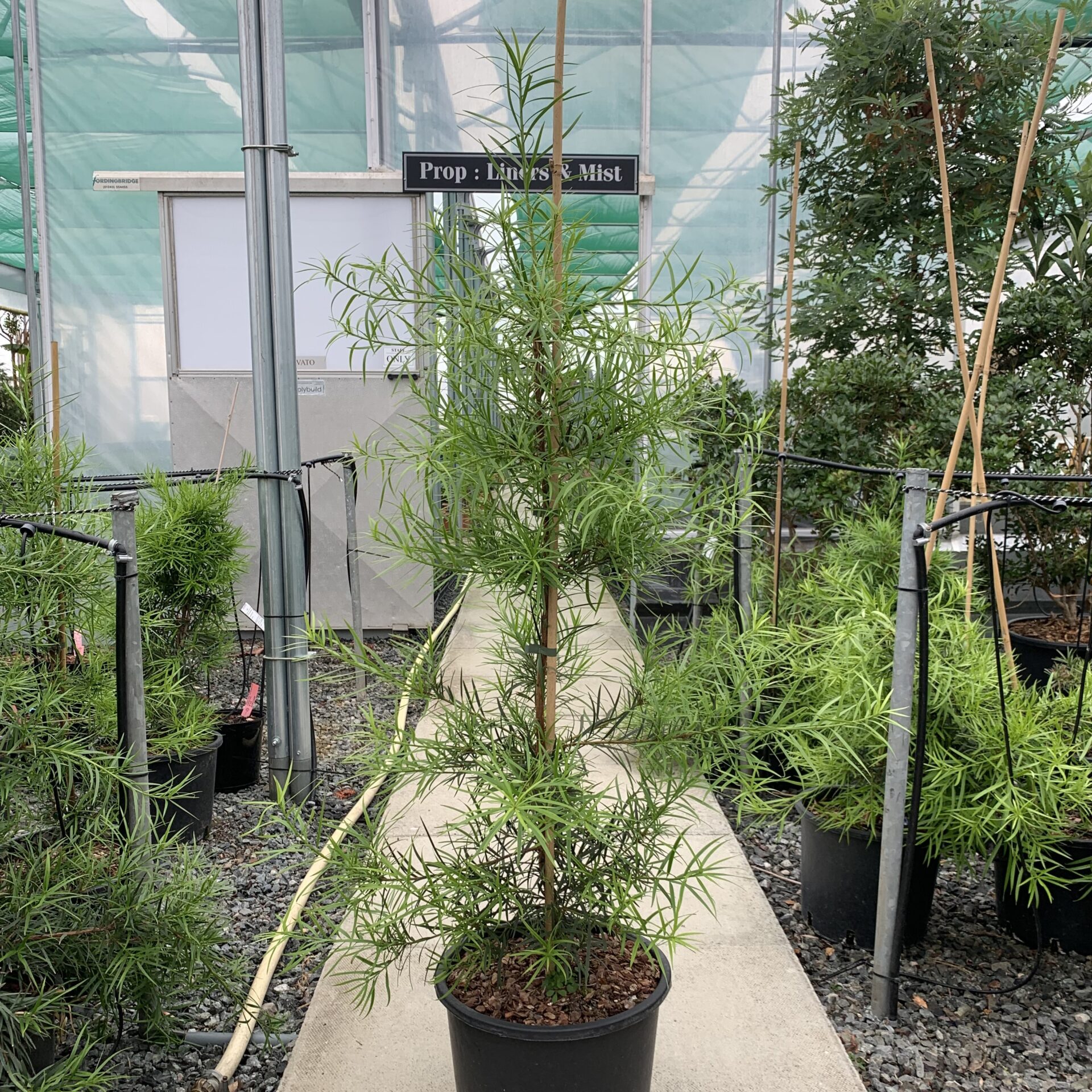 When we started the nursery, propagation of this tree was a problem. We took cuttings from the plant at (what was by then) South Lodge Hotel (with their cahoots, of course) but the plants we produced behaved like branches and grew along rather than up. Not so good. We occasionally managed to get seed from South America but it's considered endangered in the wild so even this source dried up. Fortunately we discovered a garden in Cornwall where they had so many, they strimmed the seedlings. Annual pilgrimages were made to this secret location for many years. Eventually, we had so many established at the old nursery in Nuthurst that we became self sufficient in Podocarpus salignus seedlings.