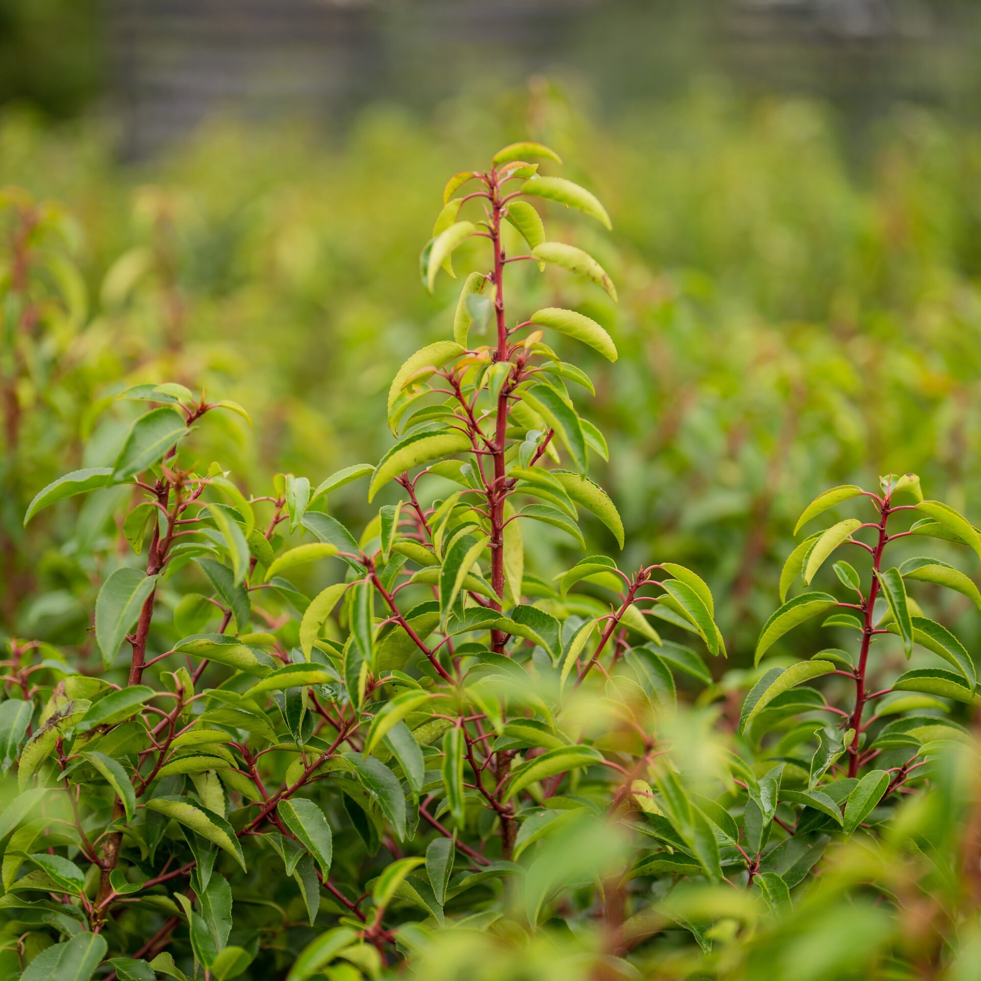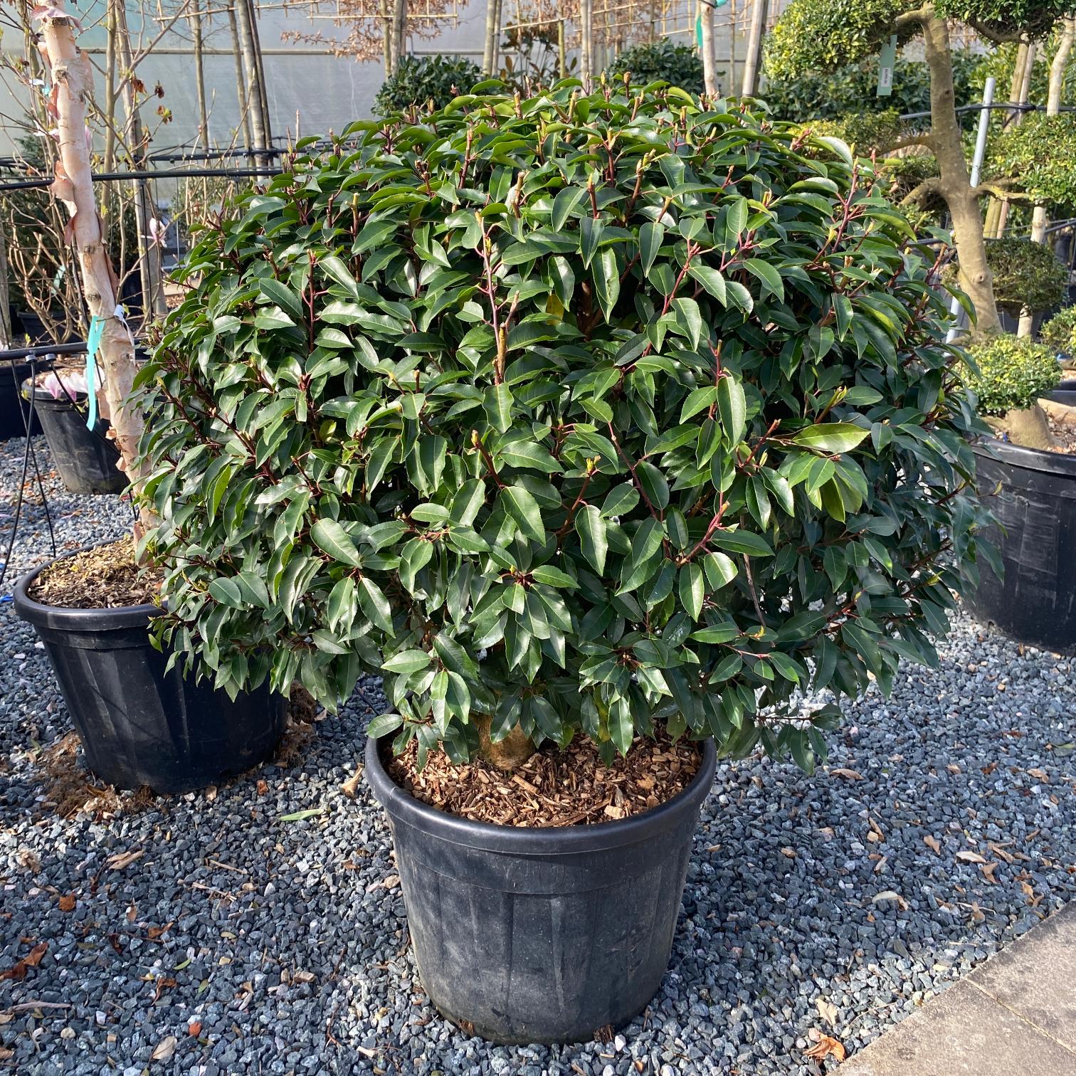 We find that 90% of the Portuguese Laurel we sell nowadays is the narrow leafed form that we call 'Mrytifolia'. It's also sometimes referred to as the form 'Angustifolia'. The leaf is smaller and narrower than the traditional form, seems less prone to pests and - frankly - is much, much prettier - especially when clipped. Its toughness and its beauty and liking for being clipped make this one of our most important crops. We can go on and on about it. And frequently do.