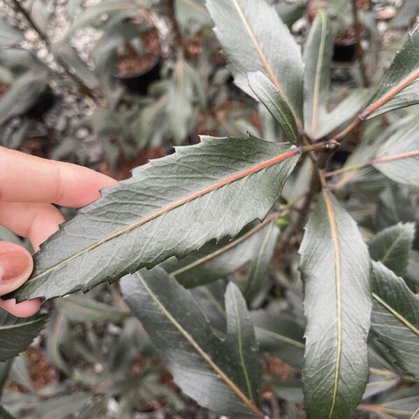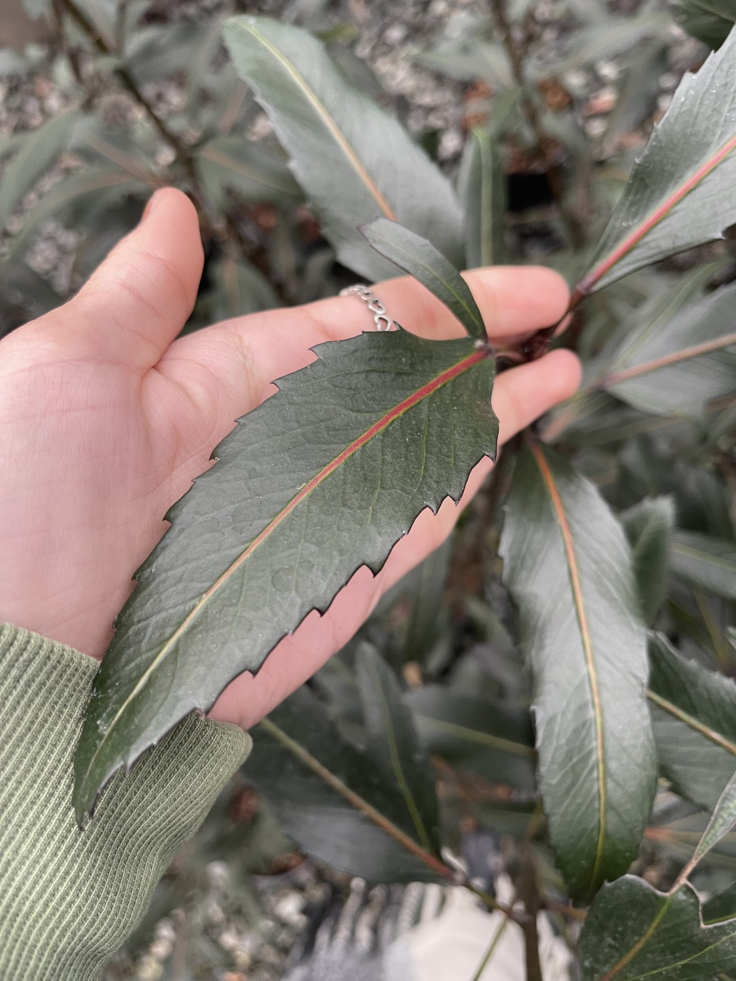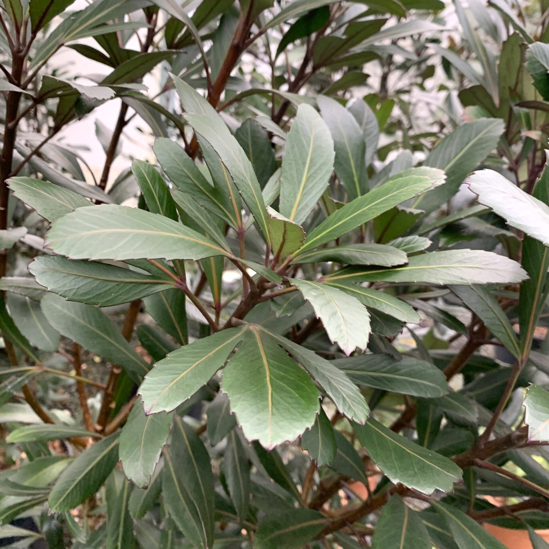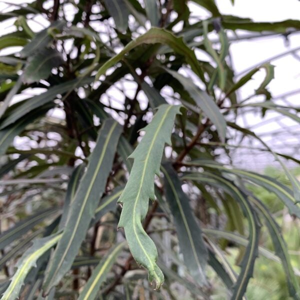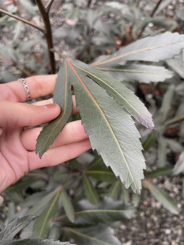 Evergreen with an upright form, the leaves are dark green and suffused with red, with a shiny veneer and veins of cocoa. They stand out even on gloomy days (and especially after rain). Large, glossy and leathery with deeply-divided lobes they have an almost primaeval quality, resembling the footprint of New Zealand’s famously out-sized, famously extinct 3m flightless bird, the Moa. Hence the name ‘Moas Toes’.
