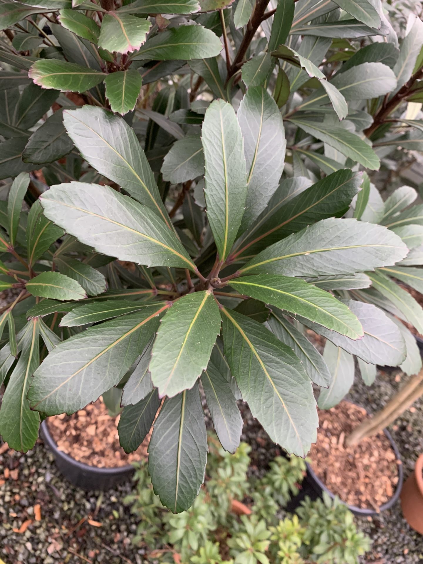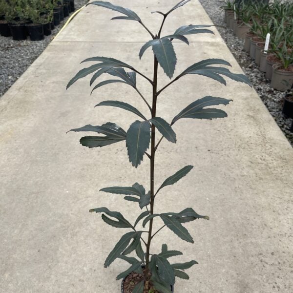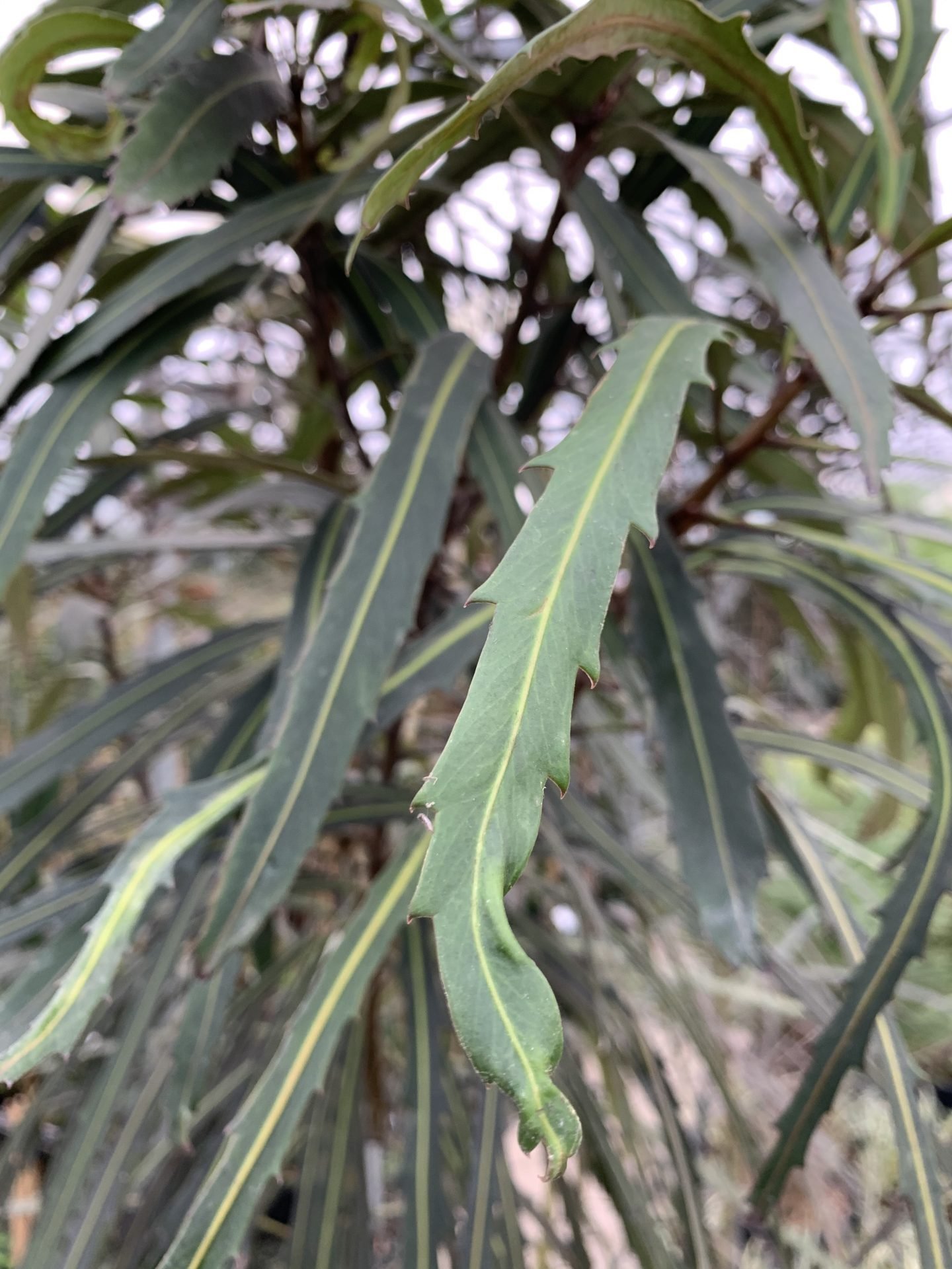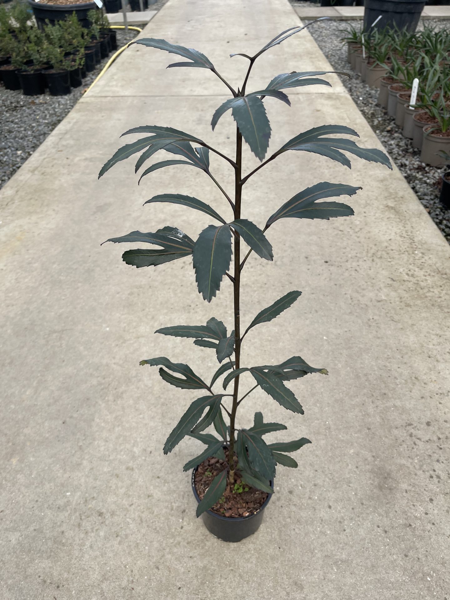 Evergreen with an upright form, the leaves are dark green and suffused with red, with a shiny veneer and veins of cocoa. They stand out even on gloomy days (and especially after rain). Large, glossy and leathery with deeply-divided lobes they have an almost primaeval quality, resembling the footprint of New Zealand’s famously out-sized, famously extinct 3m flightless bird, the Moa. Hence the name ‘Moas Toes’.