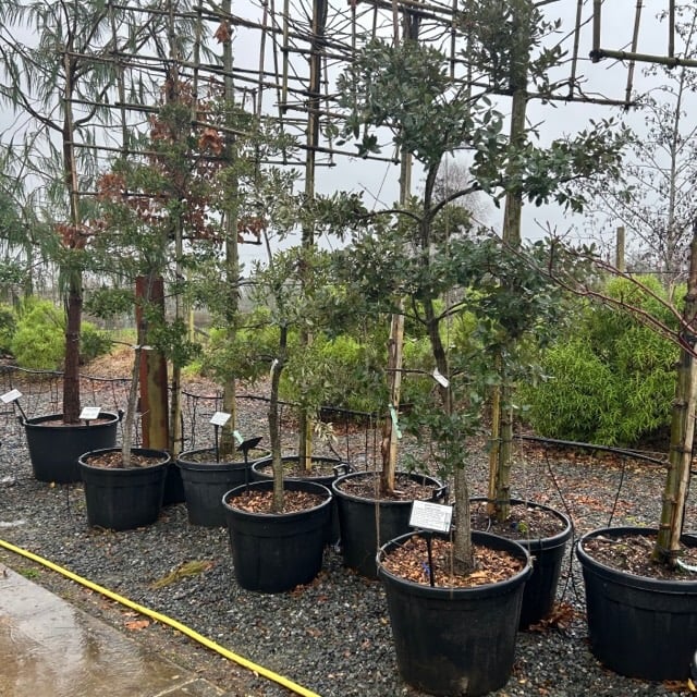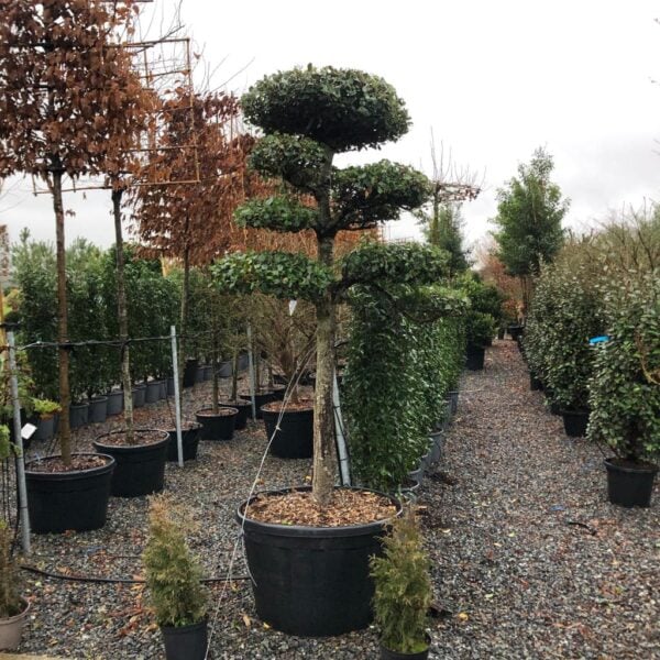 These gorgeous trees are very special. Grown from acorns planted 25 years ago and artfully cultivated into the unique forms you see here today. ‘Niwaki’ or sculpted trees of a quality like these are rare and choice indeed. It takes an astonishing amount of patience and dedication to achieve these shapes: each tree is its own landscape of vaulted cloud and pillowcultivated over time by our team of dedicated (obsessive) Niwaki experts. Since they’re sturdy old and adaptable Quercus ilex they will grow in whatever you put them in from chalk to clay (although potted into a gargantuan vessel would also be breathtaking) and they are unfussy about aspect. They manage extremely well in windy coastal spots and are equally as happy in a sun-drenched courtyard.