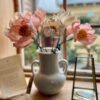 A distinctive crackle glaze this taller vase with chunky handles. Style with tall slender stems for a striking display.