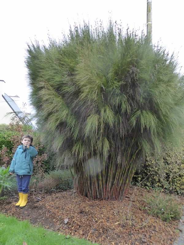 They're hard to describe but they're certainly striking to look at and owe something to the grasses and rushes. They get quite big (8ft tall x 6ft wide), don't spread but have perpendicular stems in the centre surrounded by floppier ones round the edge. They can be tidied up round the edge like the one in the photo with 5 year old Jack.