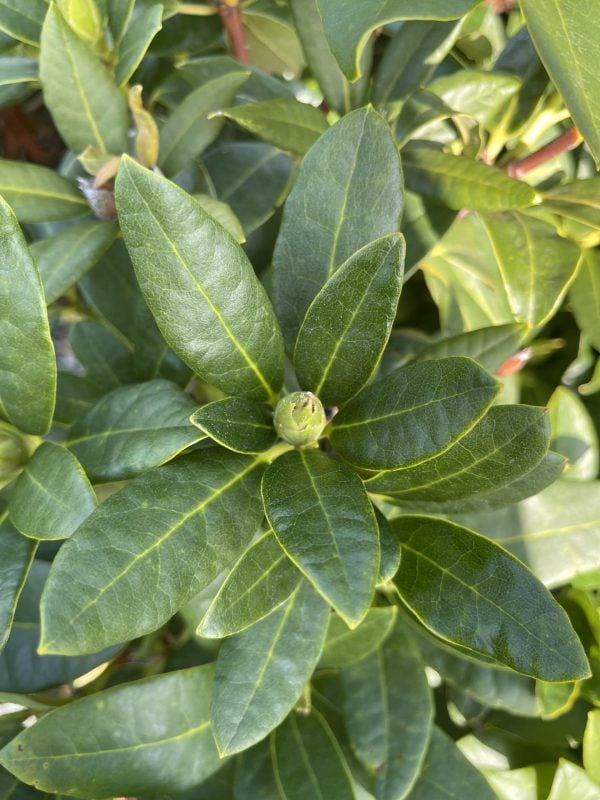 Being small(ish) yet mighty, one of the best aspects of this rhododendron is its compactness of form while still managing to produce grown-up-sized trusses of blooms. That’s quite rare among this group of glossy-leaved shrubs and we definitely recommend this one. Big pompoms of wavy-edged flowers pop out of fat pink buds in spring, and their colour romps through almost all the orange spectrums, from apricot to marmalade to salmon. Delicious to look at. The leaves of ‘Orange Flirt’ are typically rhododendron-like with a crisp central fold and a nice dark shiny green to their upper sides, paler below. Good for a mixed planting of evergreen shrubs and trees of varying heights, the broad-but-low habit of this one creates a very pleasant rolling mass of expansive green in a garden design, and it’s one which you can let tumble right to the front. If you’re on chalk you can still flirt with these: just pop one in a big planter.