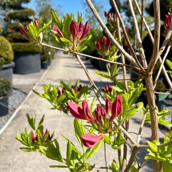 A hardy, deciduous azalea that can reach 150cms over 20 years. In May and June, the large, fragrant flowers emerge pinky-red with an orange or yellow splodge, often followed by good leaf colour in the autumn.