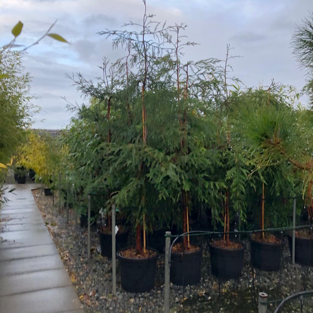 This was introduced to Britain from California in the 1840s and some are now over 150ft tall although because both the Redwoods tend to tower above everything else they often get their tops removed by lightening strikes. The English obsession with collecting makes this more likely as the trees are so often planted on their own, as single specimens. Plant them in groves! We need more groves! We have a customer who planted a grove of 23 of them immediately (yes, immediately) outside his back door. Can you imagine? Straight out of the back door in East Sussex into California. A near Narnia-through-the back-of-the-wardrobe experience. He calls them 'The Boys' and God knows what his foundations will be like in 50 years time but as we all know, one must suffer for one's art.