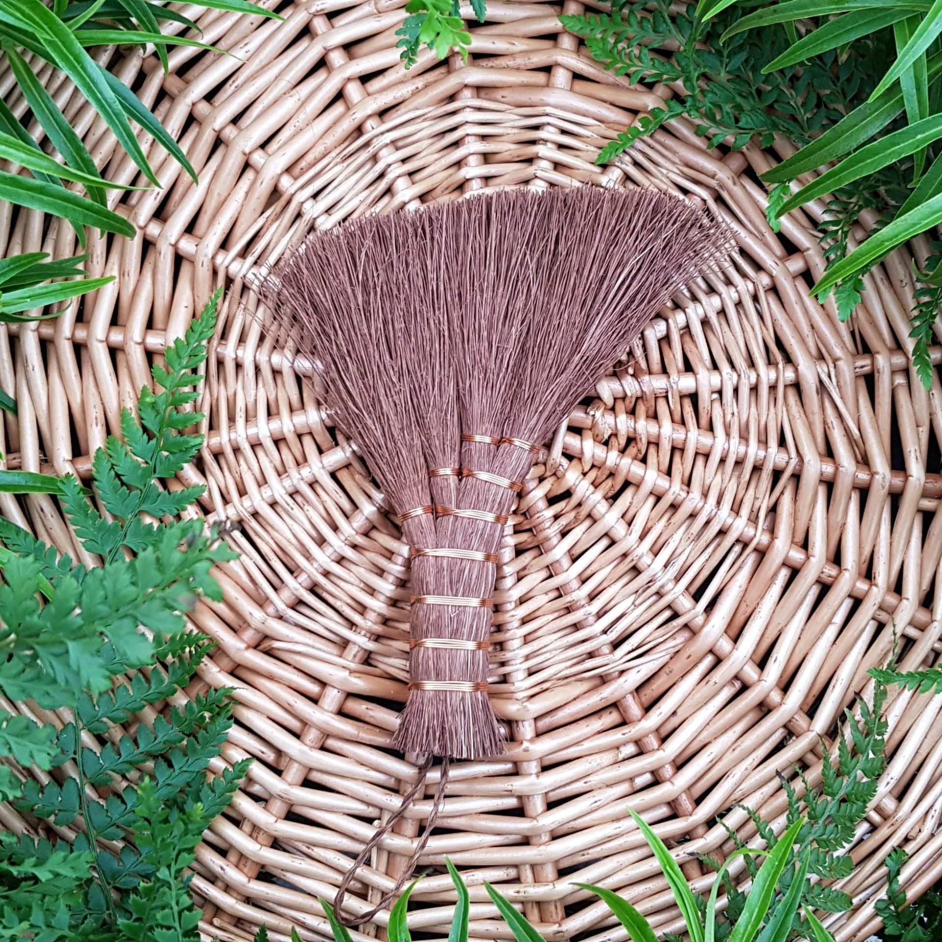 Small but classy Japanese hand broom for all your domestic chores! This little brush is made from the palm fibres of Trachycarpus fortunei, bound together with copper wire. Great for careful sweeping of bonsai and other potted plants, corners of terraces and patios, ground covers such as moss and mind your own business, and in the home. The angled profile allows for broader sweeps as well as more careful, shorter ones. Not very big, but very classy.