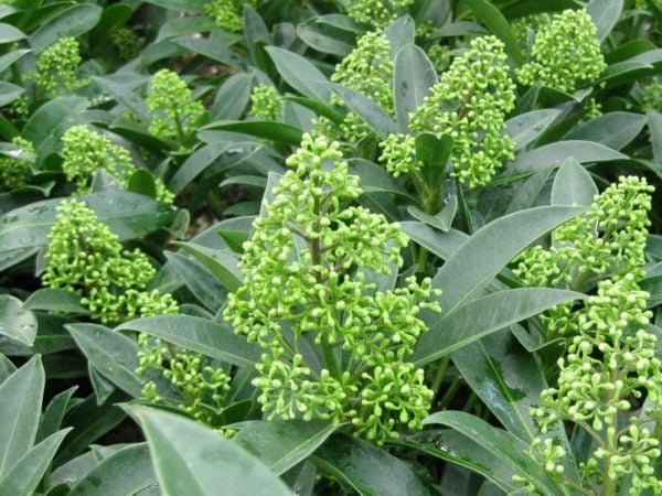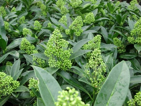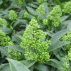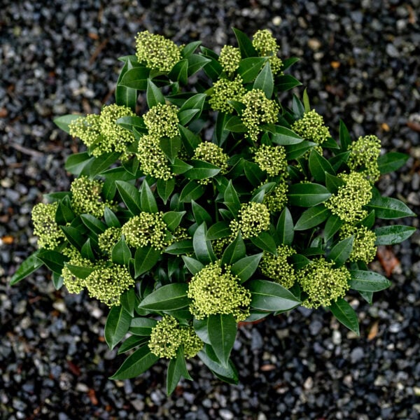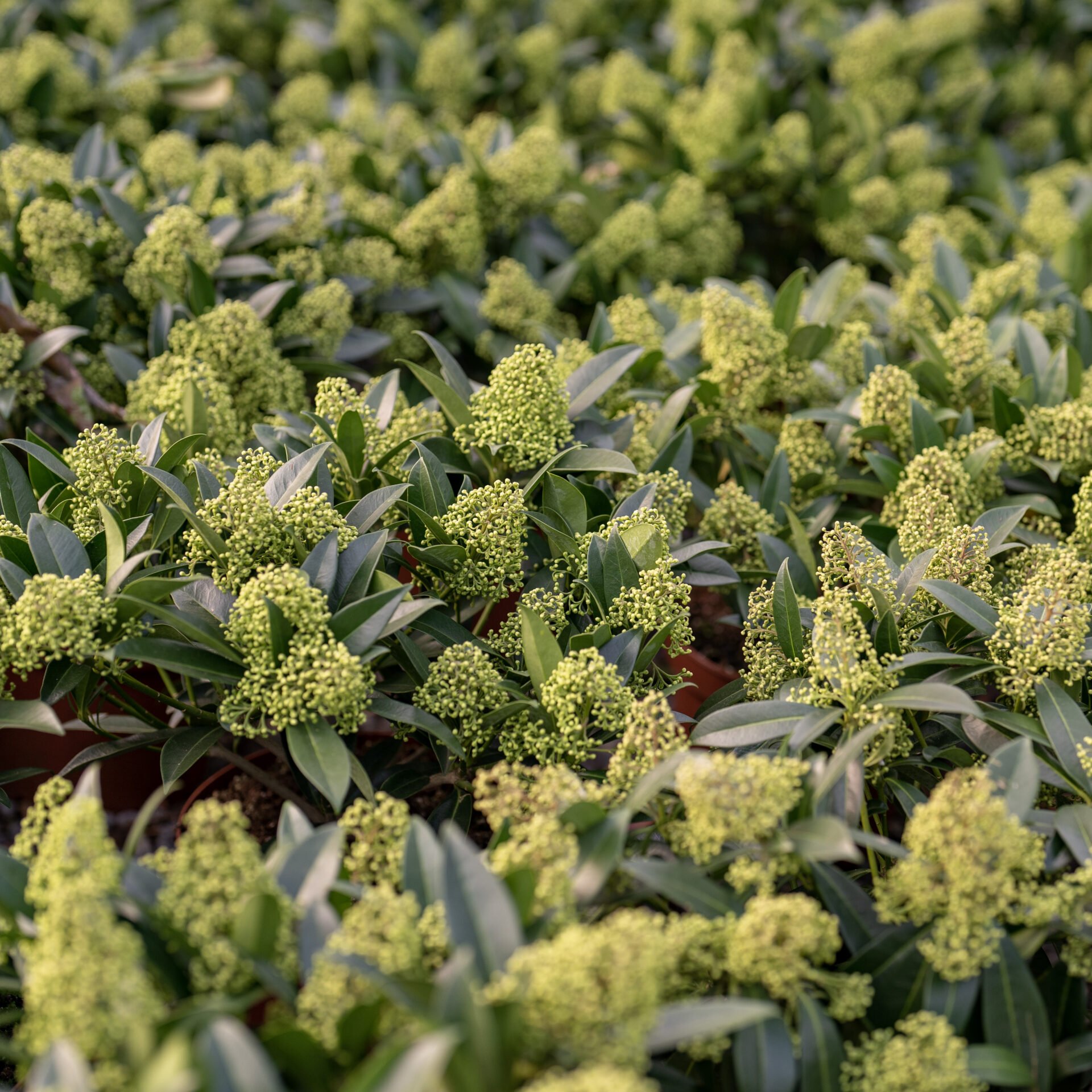 A male form of Skimmia with large flower clusters. Plant where you can smell the Lily of the Valley scent.