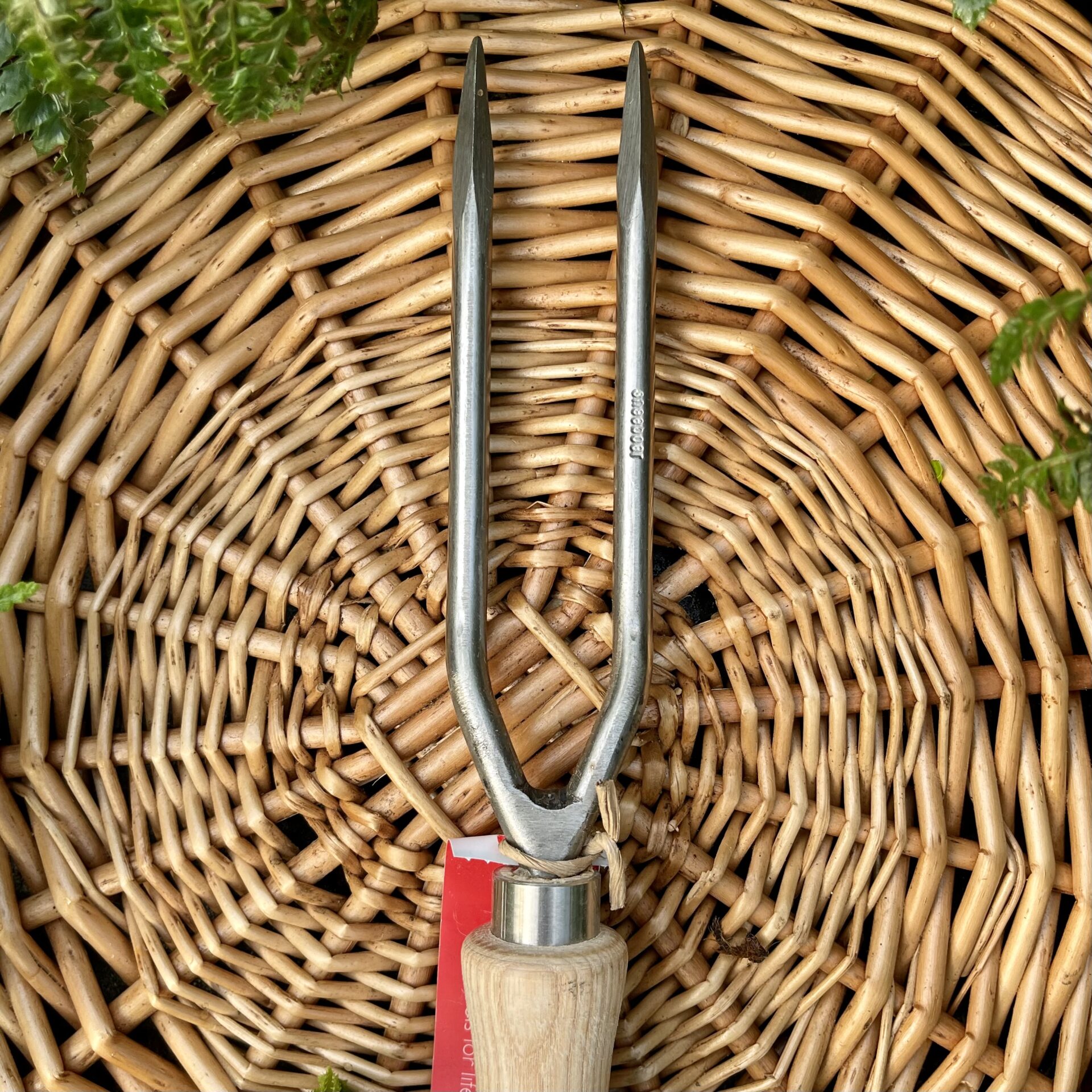 The two-pronged weeding fork loosens the earth around the roots, enabling the weeds and their roots to be removed with ease. The ends of the times have been formed into a sharp point, but the rest of the tines are round so the roots of surrounding plants will not get damaged while using this tool.