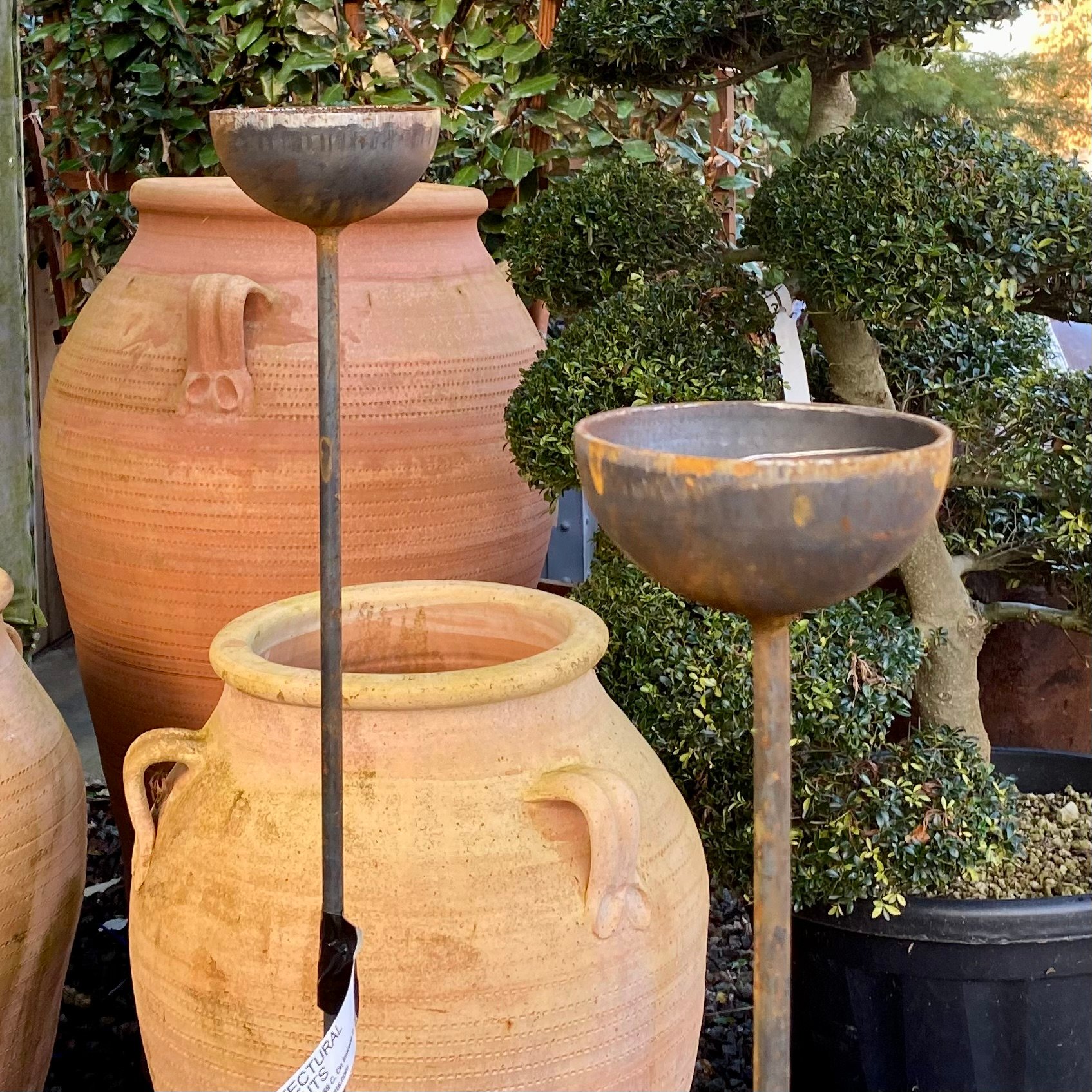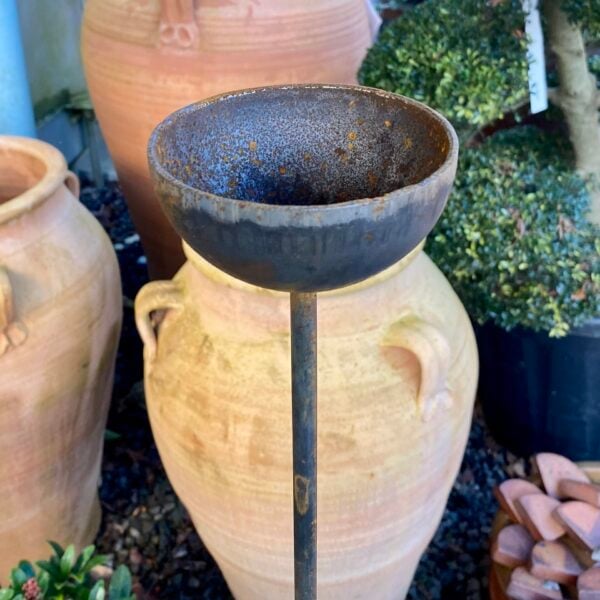 Add some additional vertical drama to your garden with these hand forged steel garden rain catchers.