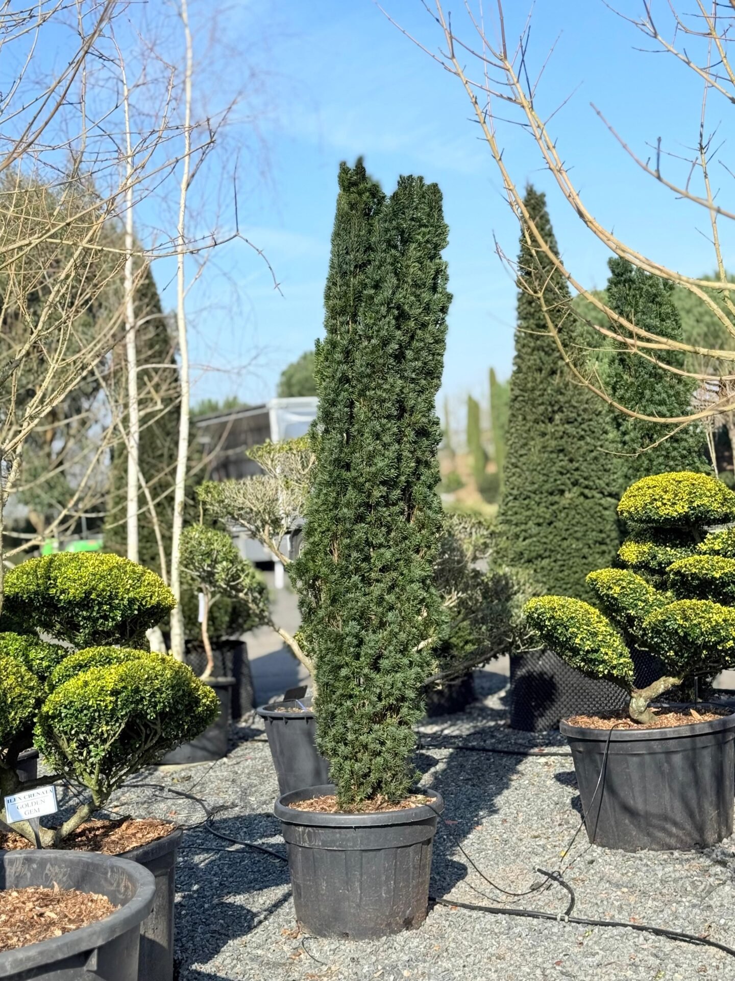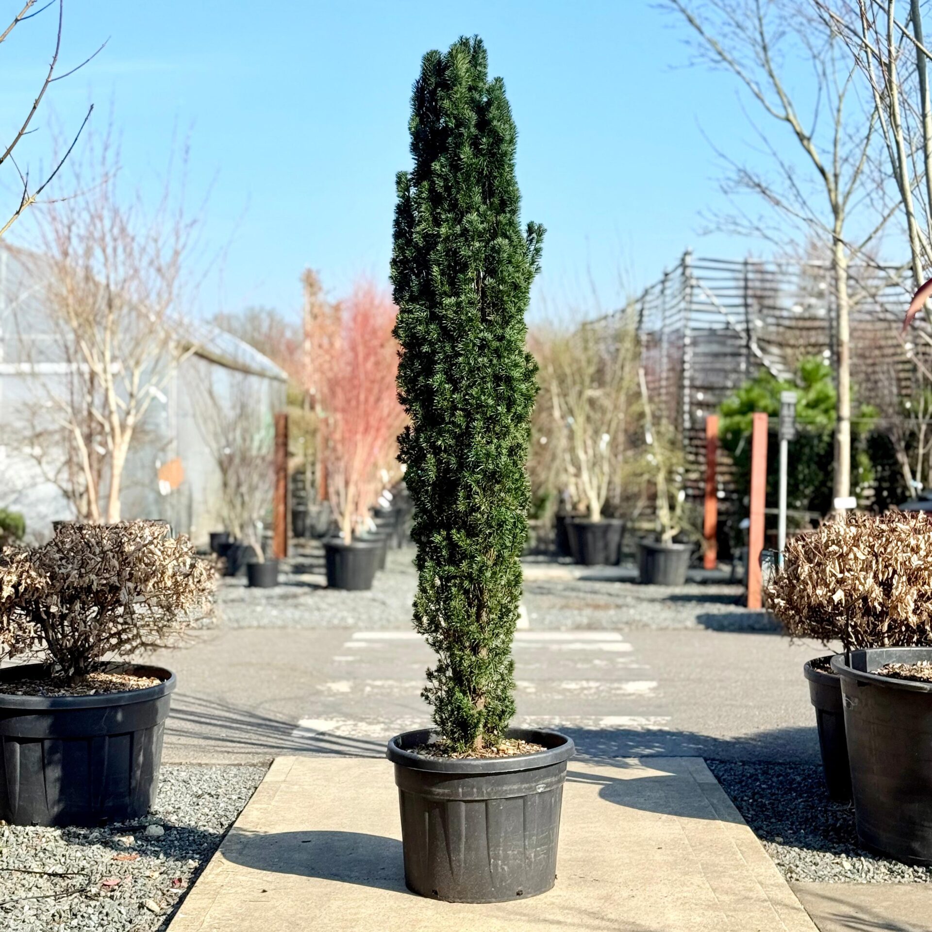 A slender columnar Yew that can grow, over half a century to 12m x 4m. The multistemmed growth is strong and upright with classic dark green yew foliage.