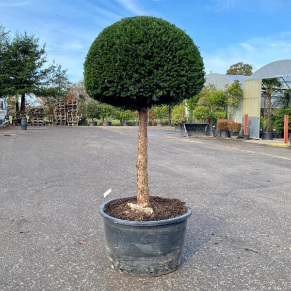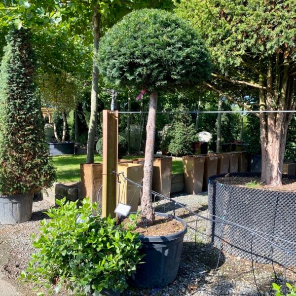 A variety of cleared stem heights and girths are available for the bark-lover along with different shapes and sizes of head to satisfy your textural desires. Plant as a pair in generously sized pots or in more ample quantity as an avenue or grove. Relatively slow growing. Will require a fair amount of light either in dappled shade or sunlight. Will need attentive care when first planted and regular clipping to keep in shape. Happy in clay, dry / well drained soil but not good on chalk (Ericaceous).